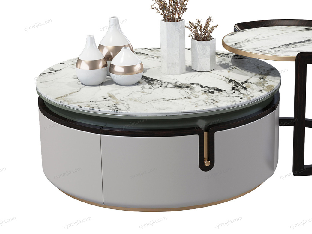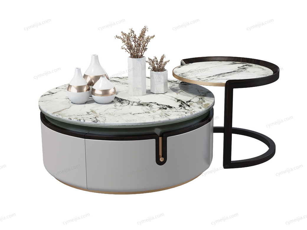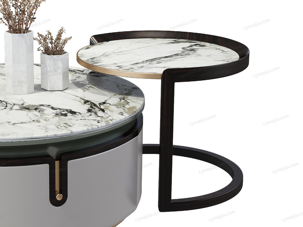 | 产地 : 佛山 | 规格 : 大茶几:直径900*高400mm,小茶几:直径630*高530mm | 产品材质 : 黑檀木框+盛夏之舞亮光岩板面+E1级实木多层板+实色漆 | 更多参数>> |