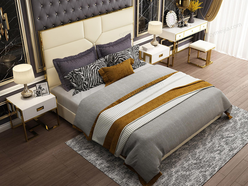 | 产品材质 : | 优质夹板+实木+高弹海棉+优质仿真皮+不锈钢拉丝封釉镀钛金+10公分松木排骨架 |