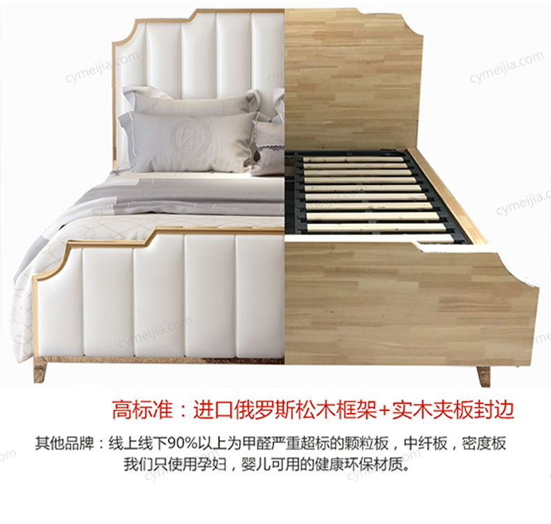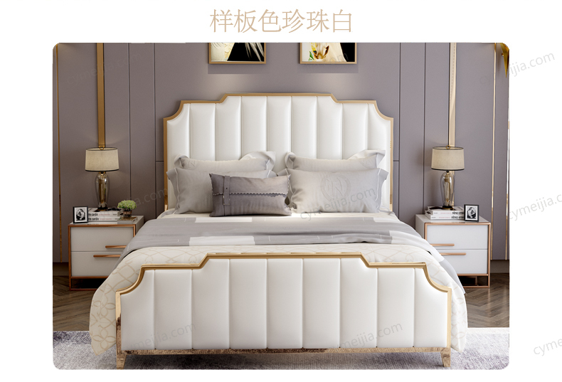 | 产品材质 : | 优质夹板+实木+高弹海棉+优质仿真皮+不锈钢拉丝封釉镀钛金+10公分松木排骨架 |