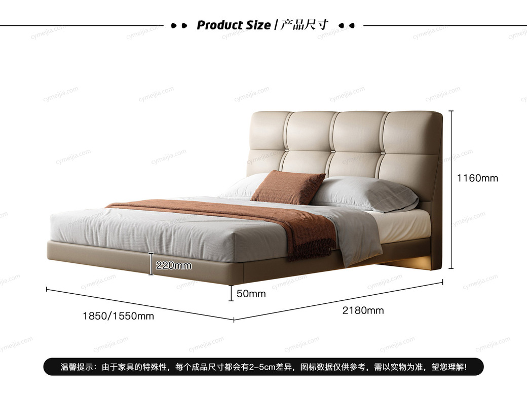 | 产品材质 : | 仿真皮+高密度海绵+俄罗斯落叶实木框架+灯带+碳素钢脚+十公分松木排骨架 |
