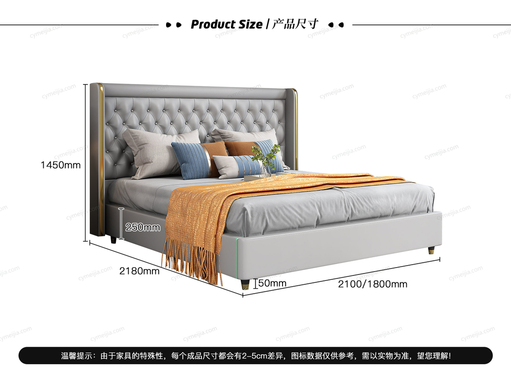 | 产品材质 : | 头层黄牛皮(接触面)+仿真皮(非接触面)+实木(床侧)+10公分松木排骨架 |