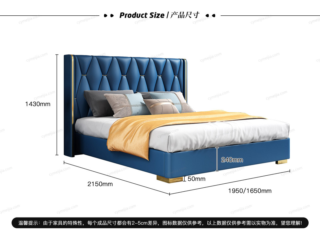 | 产品材质 : | 头层黄牛皮(接触面)+仿真皮(非接触面)+实木(床侧)+10公分松木排骨架 |