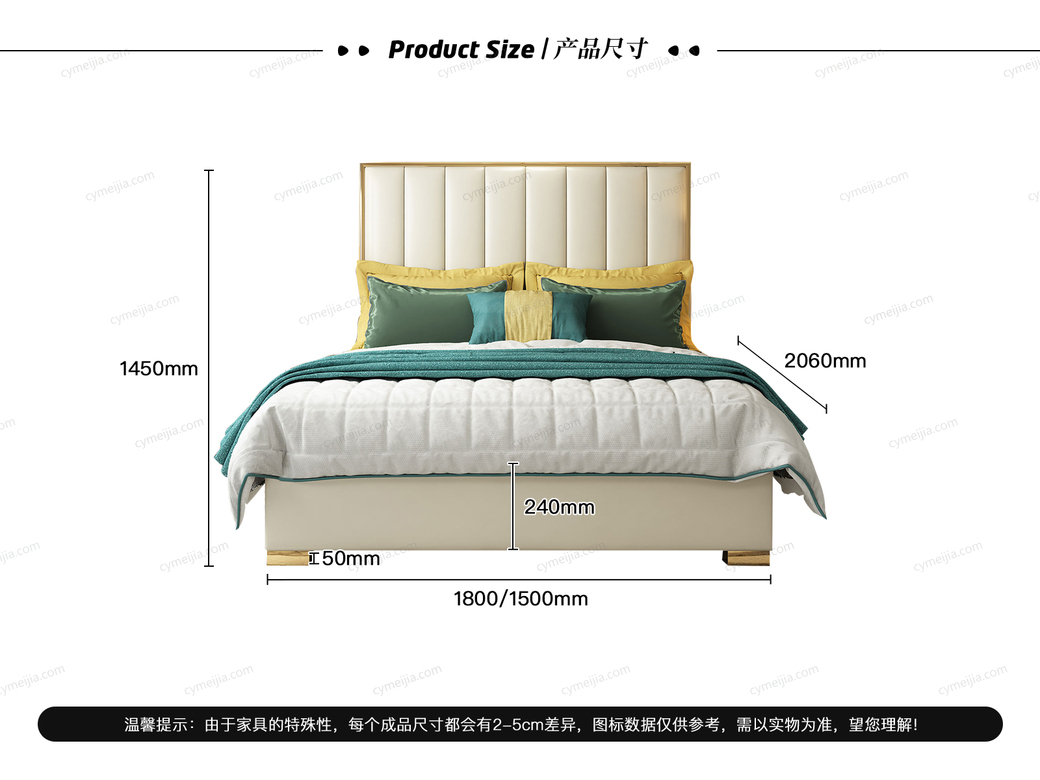 | 产品材质 : | 头层黄牛皮(接触面)+仿真皮(非接触面)+实木(床侧)+10公分松木排骨架 |