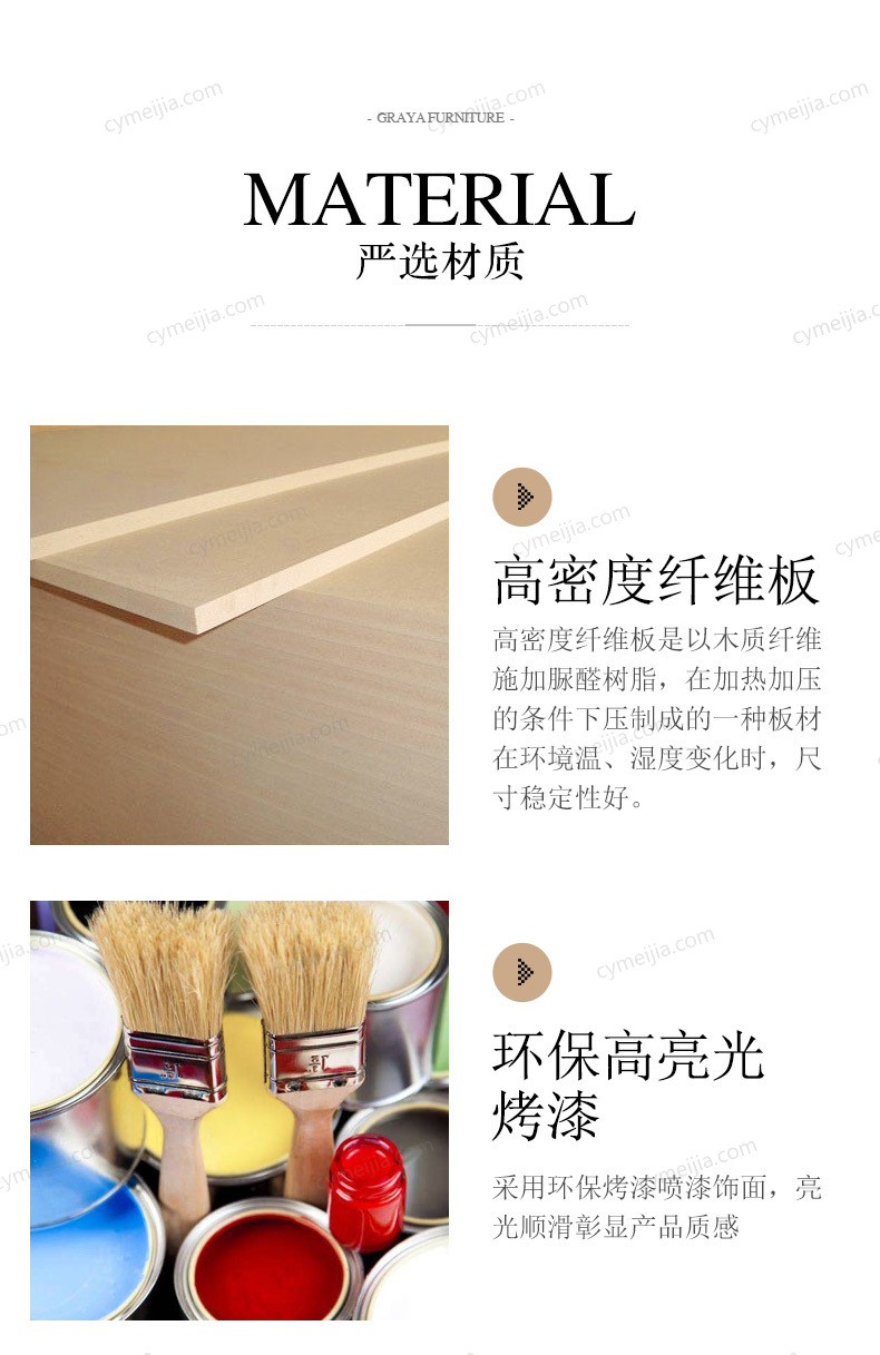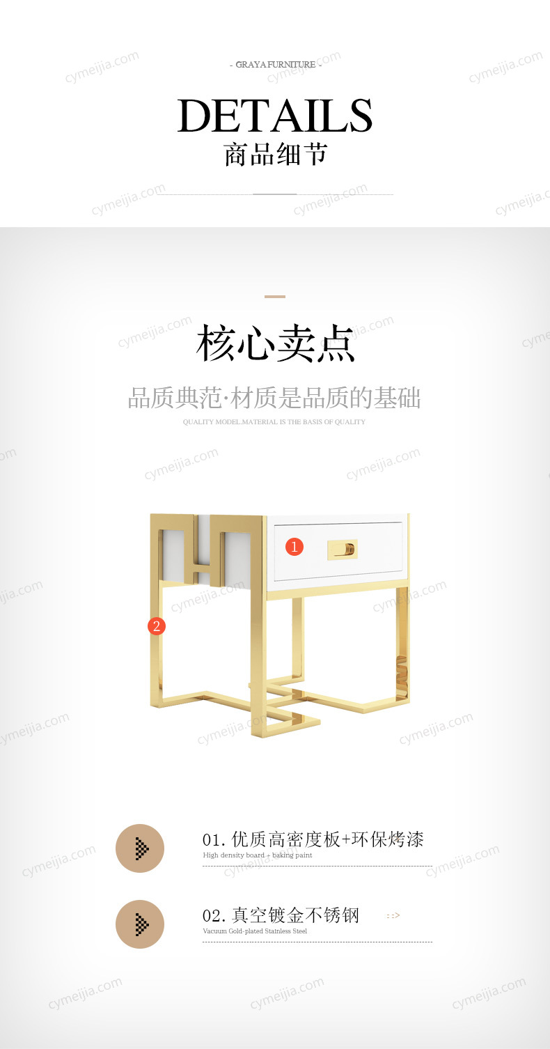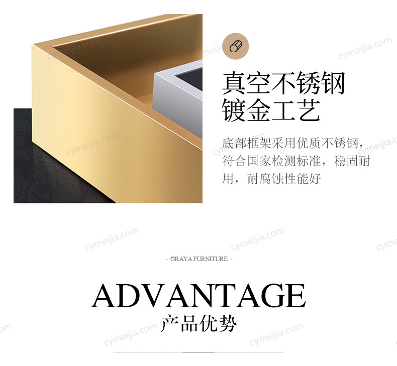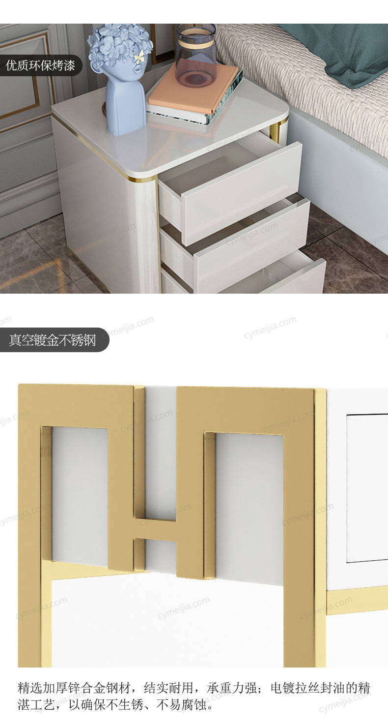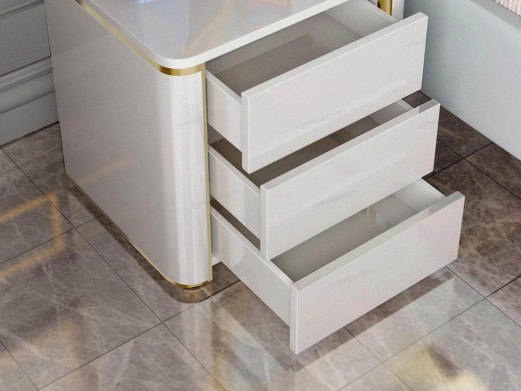 | 产品材质 : | 进口环保高密度板+烤漆+实木抽屉+不锈钢拉丝封釉镀钛金 |