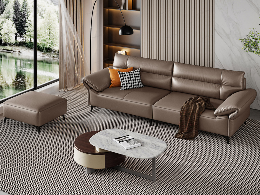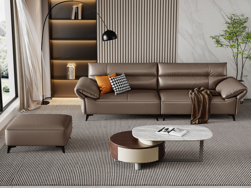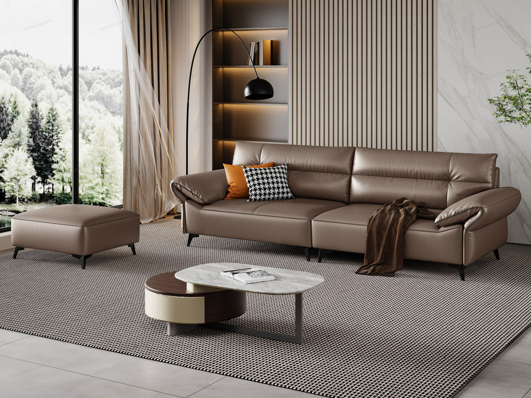 | 产品材质 : 接触面进口头层黄牛皮+羽绒+高密度海绵+俄罗斯落叶松实木框架+13公分哑黑五金脚 | 包件数 : 3 | 包装体积(m3) : 2.22 | |
