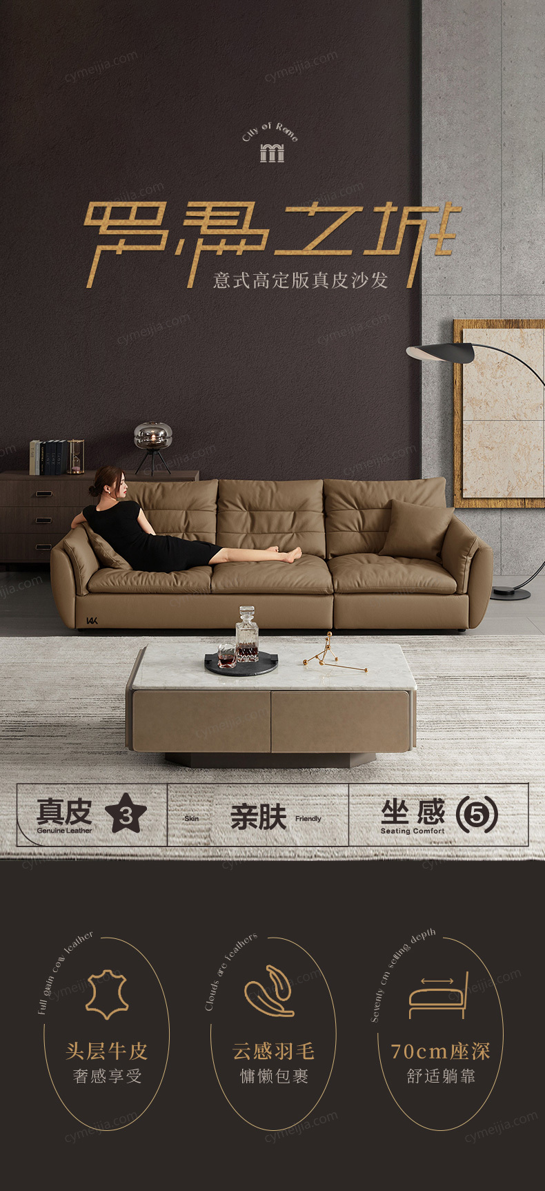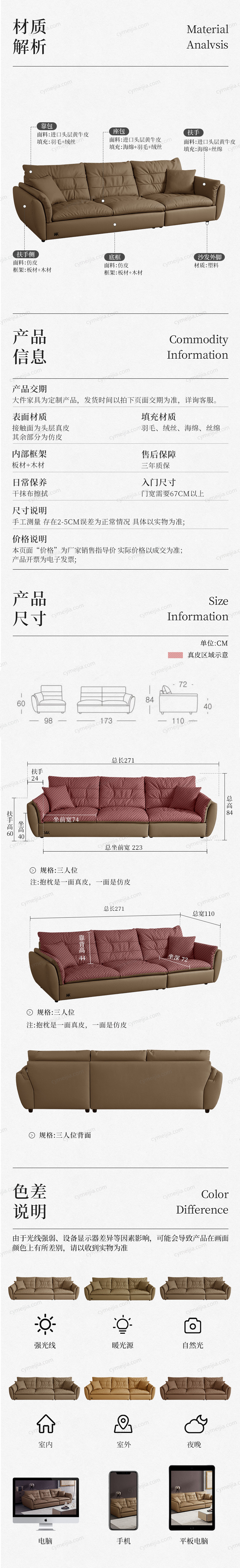 | 产品材质 : | 接触面进口头层黄牛皮+羽毛+高密度海绵+实木框架 |