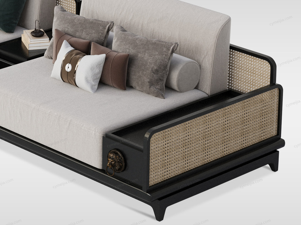 | 产品材质 : | 白蜡木+布艺+藤编工艺+高密度海绵+俄罗斯落叶松实木内框架 |