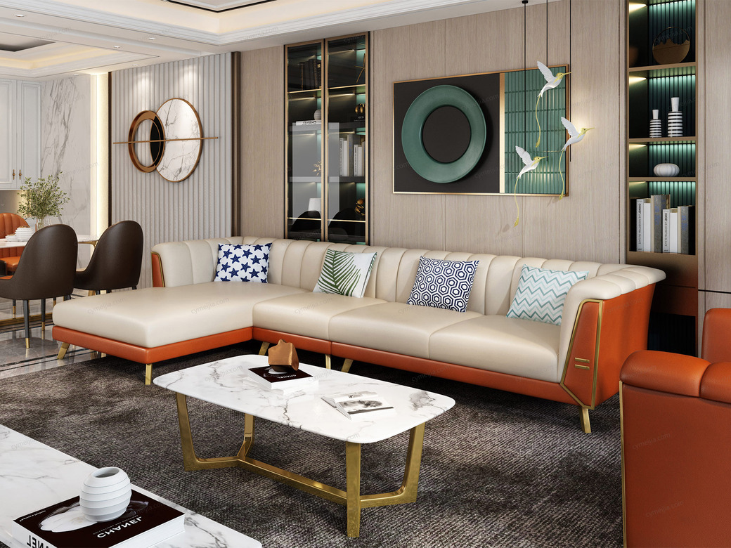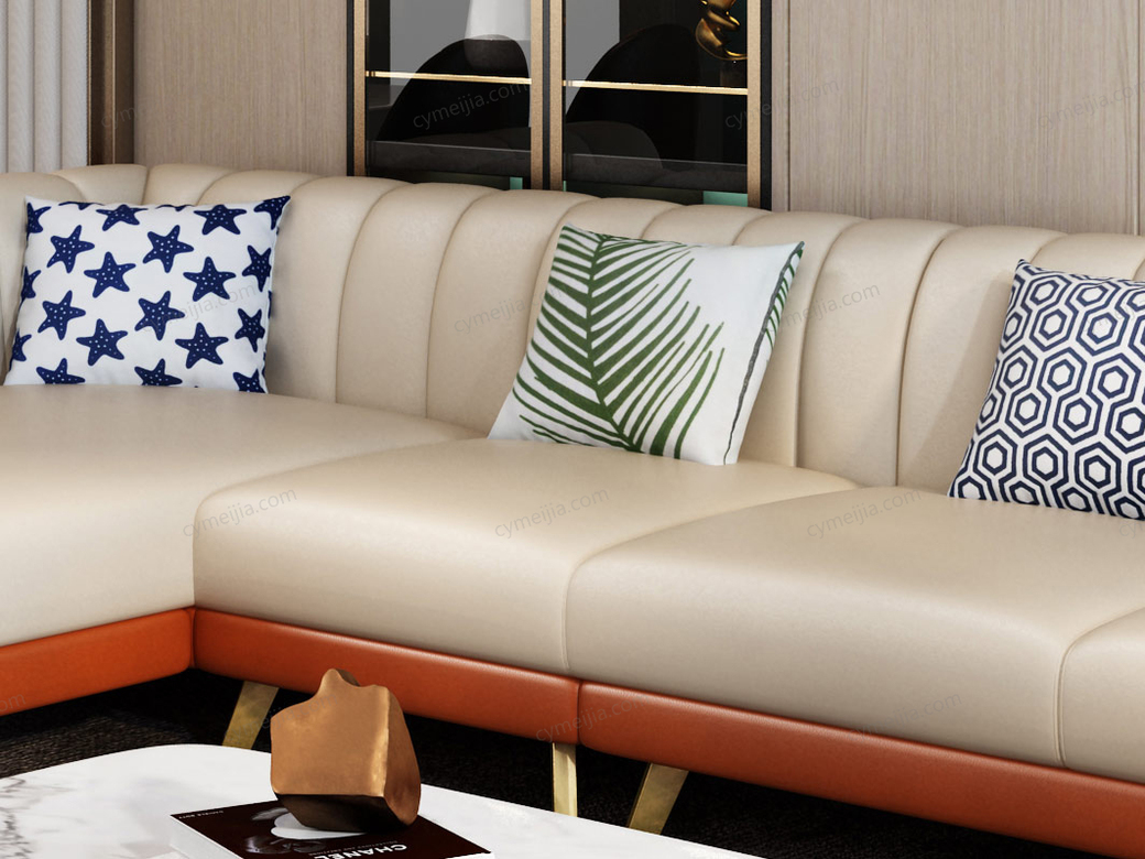 | 产品材质 : 底框架优质亮光加密仿皮+人体接触面优质亮光仿真皮+超纤皮(坐包面、坐包前、扶手面、靠背面)+抱枕涤棉布料填充A+太空棉+抛光实木内架(桉木为主)+蛇形弹簧+高弹力橡筋+高密度纯海绵+扶手镶钛金五金+可拆装镀金五金脚 | 包件数 : 3 | 包装体积(m3) : 2.34 | |