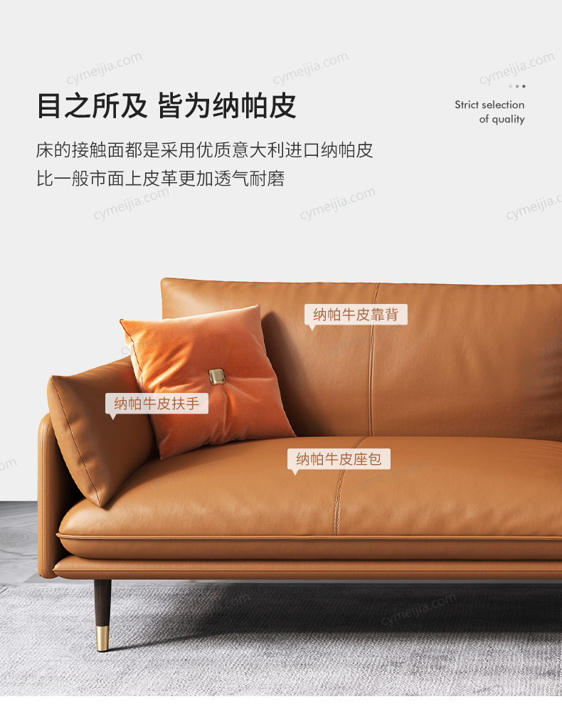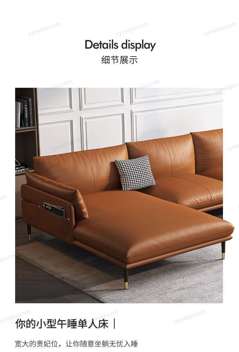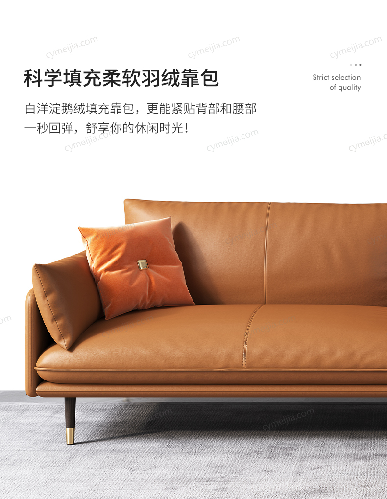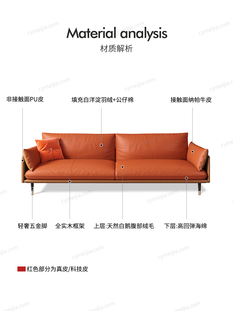 | 产品材质 : | 接触面进口头层黄牛皮+白鹅羽绒靠包+高密度海绵+俄罗斯落叶松实木框架+碳素钢脚 |