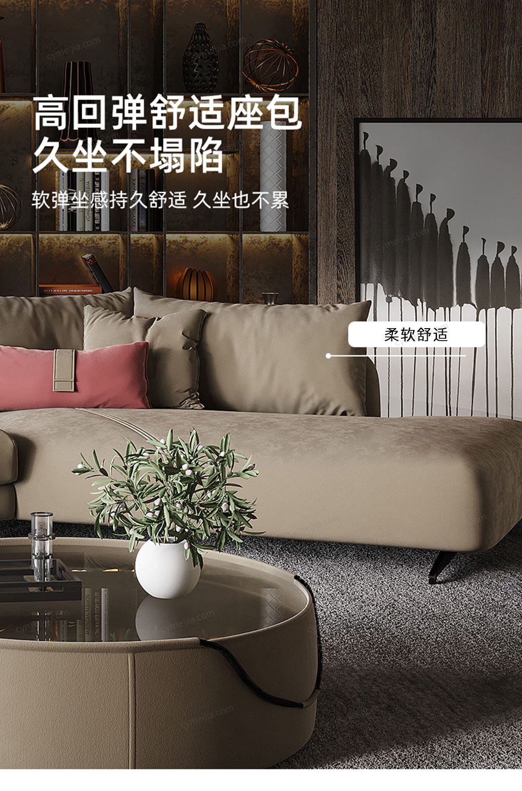 | 产品材质 : | 麂皮绒+羽绒座包/靠包+高密度海绵+俄罗斯落叶松实木框架+实木刨方+碳素钢脚 |