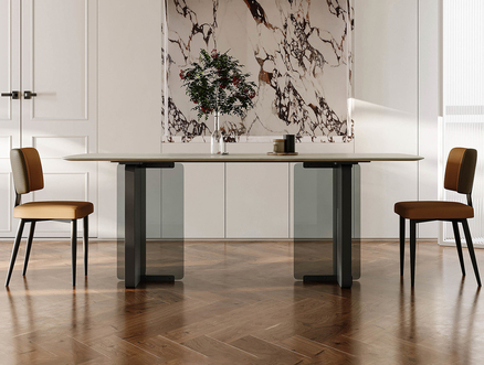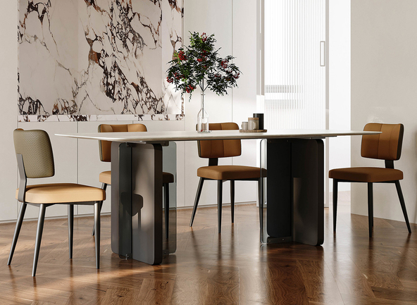 诺美帝斯 极简风格 纹理自然美观岩板 耐磨耐刮抗高温 细腻顺滑触感温润 不锈钢+钢化玻璃底座 悬浮美观开阔通透 几何造型桌腿稳固力学承托 贴心圆润弧形设计 1.4米 餐桌