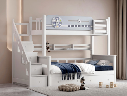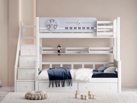 帕帕猫 简美风格 榫卯结构 精选高端实木 纹理自然 高低床 儿童床 白+天空蓝 1.5*1.9米 子母踏步床(搭配杉木uv床板)(含柜梯+书架+抽屉)