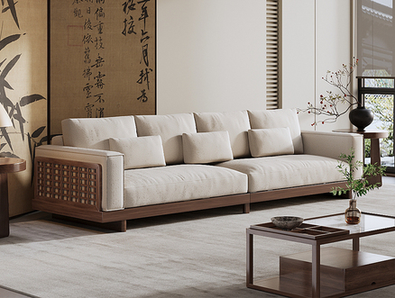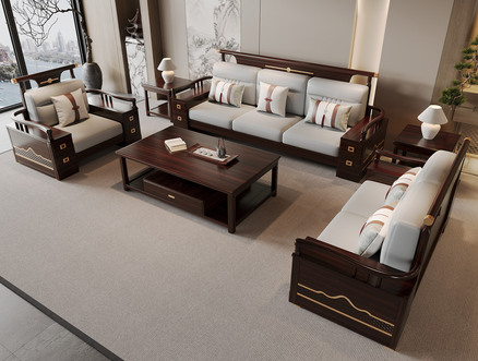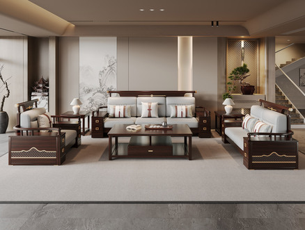 云柚居 新中式 进口实木沙发 自然清晰实木纹理 细腻舒适猫抓皮 竖线拉点饱满靠背 沙发组合 单人位+双人位+三人位