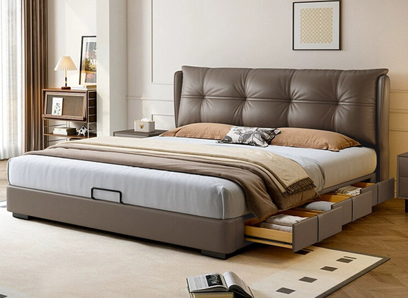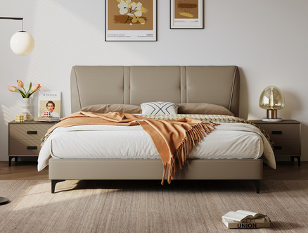 歌迪 极简风格 欧姆真皮床 绵软轻盈高级羽绒+舒适回弹高密度海绵黄金配比宽大柔软床屏 蓬松软弹靠包全方位释压 云端靠感 齐边设计节省空间 1.8*2.0米真皮床(搭配10公分松木排骨架)