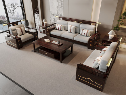 木遇东方 禅意新中式 沉稳黑檀色 进口小叶龙凤檀木 抗菌抑螨天然环保粗麻布 45D高密度Q弹海绵 高品质绿色环保大宝漆 直排四人位沙发+脚踏+休闲椅*2 沙发组合