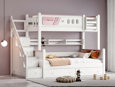 帕帕猫 简美风格 榫卯结构 甄选优质实木 健康环保 高低床 儿童床 白+桃粉 1.5*1.9米 子母踏步床(搭配杉木uv床板)(含柜梯+书架+抽屉)