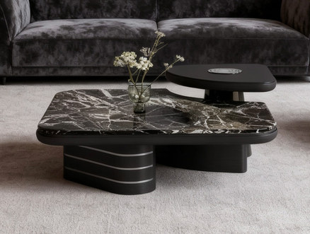 木遇东方 禅意新中式 沉稳黑檀色 光滑细腻围边岩板 优雅结构细腻线条 高低组合分层设计 高品质绿色环保大宝漆 沉稳黑檀色 1.3米茶几+实木角几 茶几组合