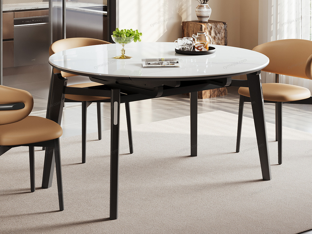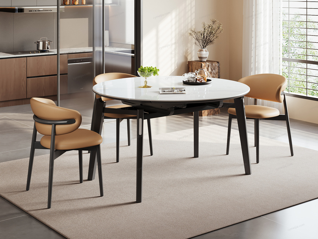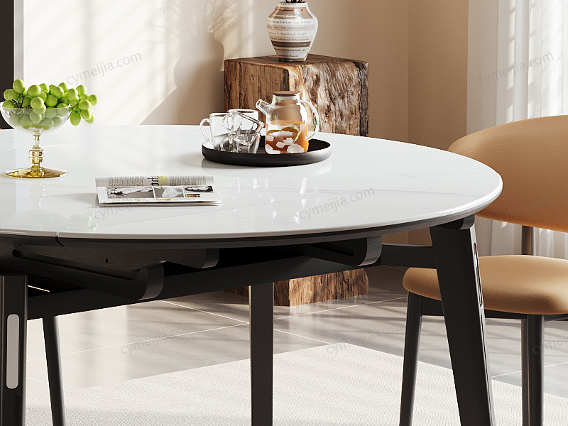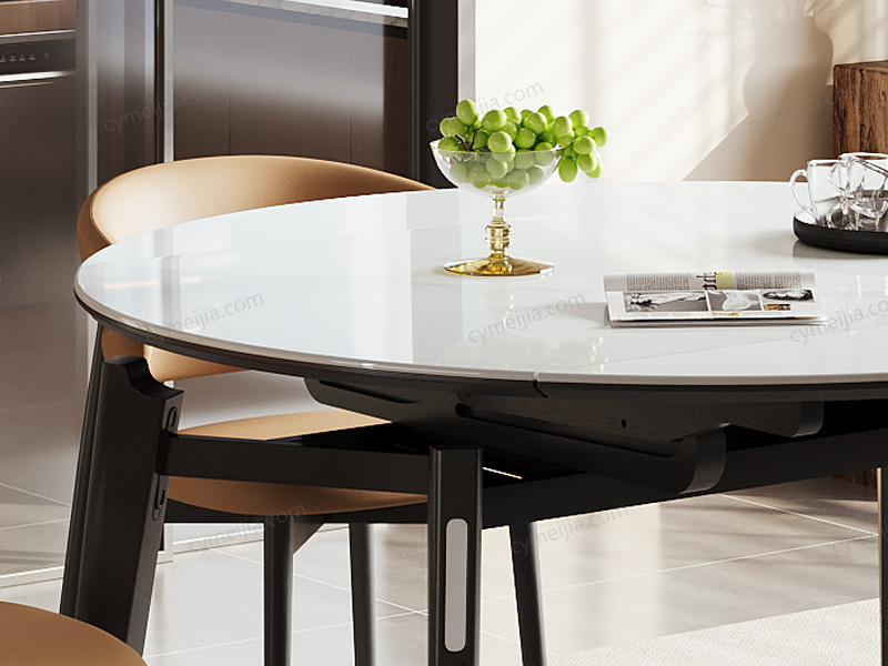 ◕ 采用优雅细花白玉微晶石台面,质地细腻通透,耐磨防刮不渗色,日常油污一擦即净,始终保持餐桌晶莹如新。