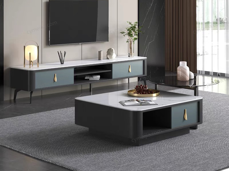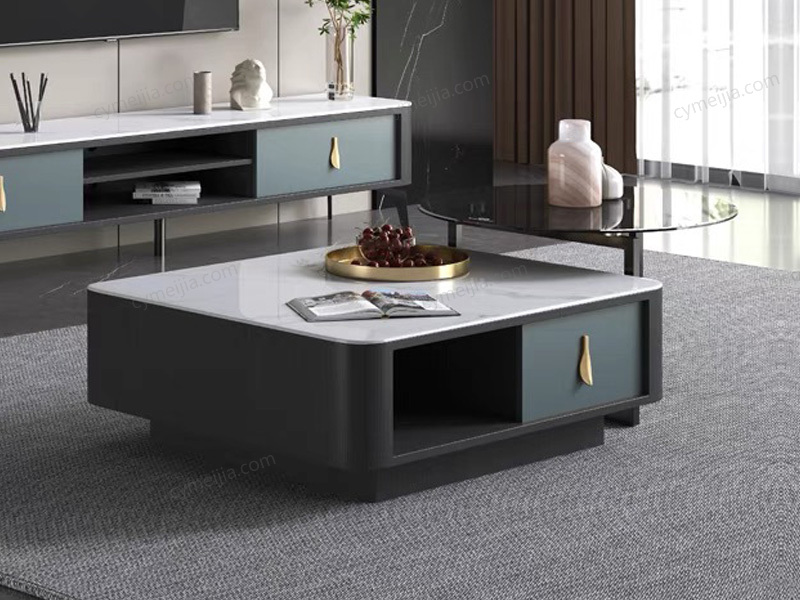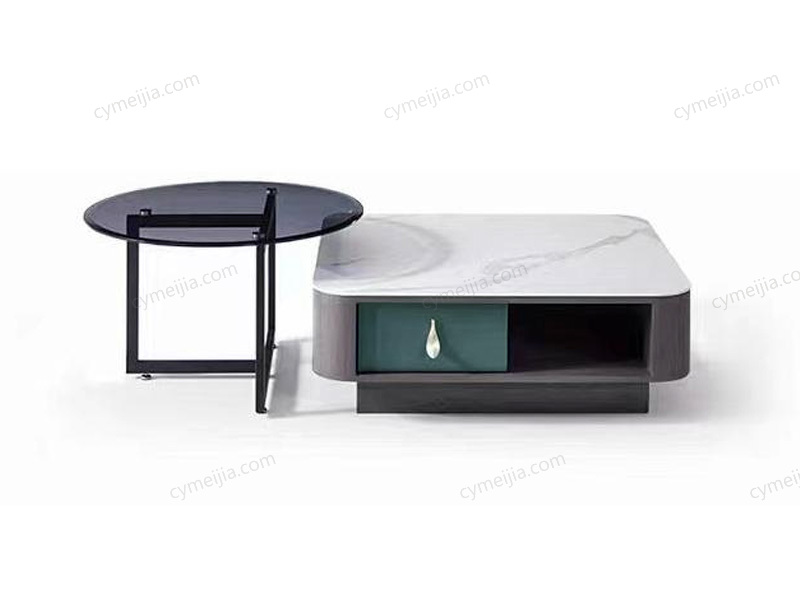 | 产品材质 : | 茶几:微晶石台面+缓冲导轨+E1级环保板材+五金拉手 角几:灰色钢化玻璃+碳素钢脚 |