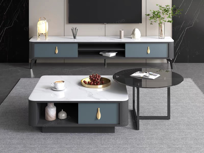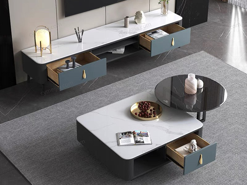 | 产品材质 : | 茶几:6mm雪山石亮光岩板面+缓冲导轨+E1级环保板材+五金拉手 角几:灰色钢化玻璃+碳素钢脚 |