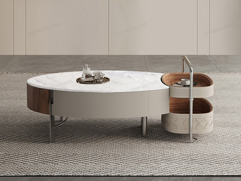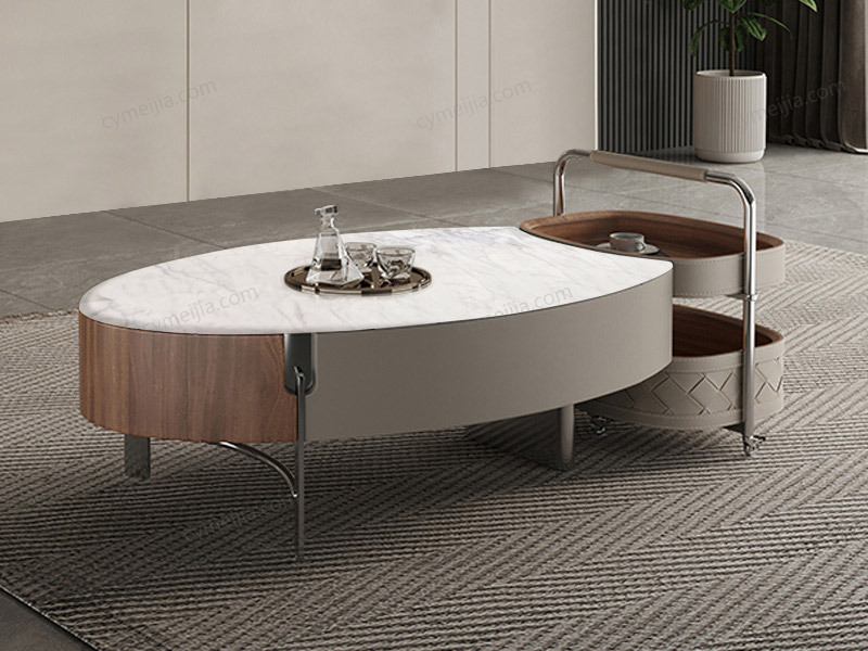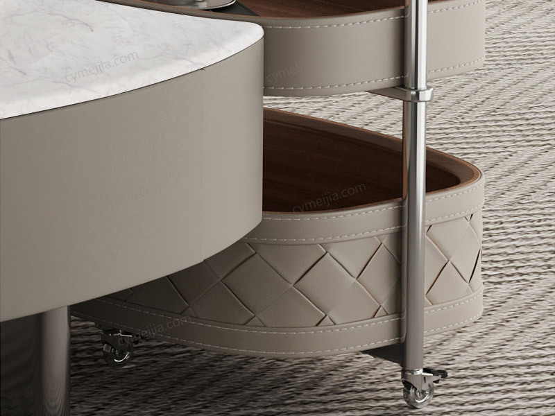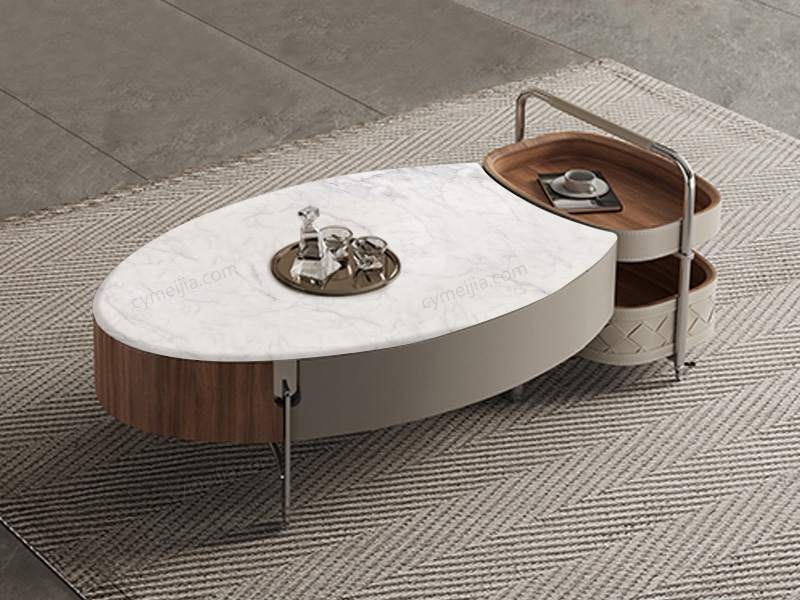 | 产品材质 : | 茶几:中花白微晶石+胡桃木皮+E1级环保板+不锈钢;角几:编织皮+不锈钢+E1级环保板 |