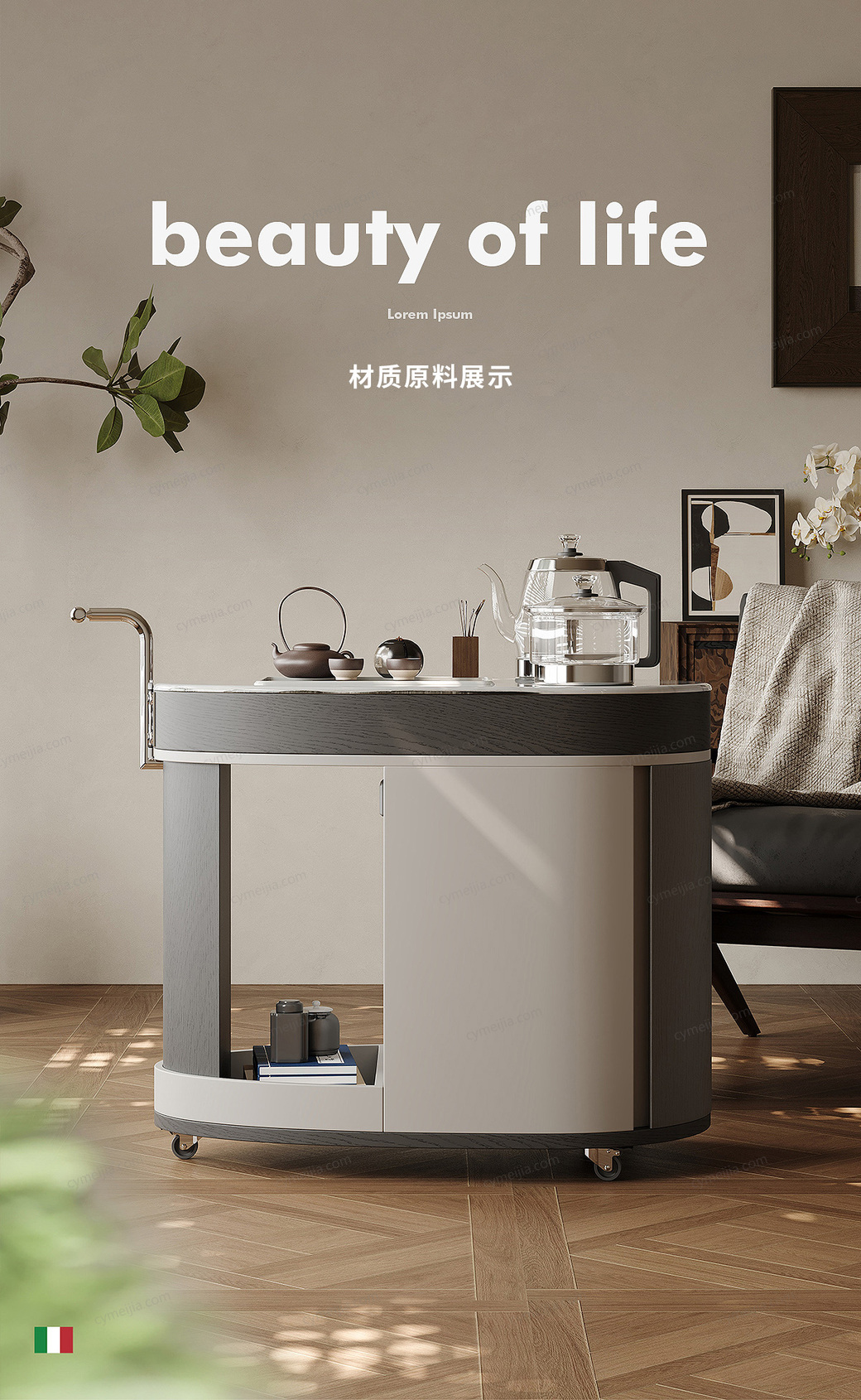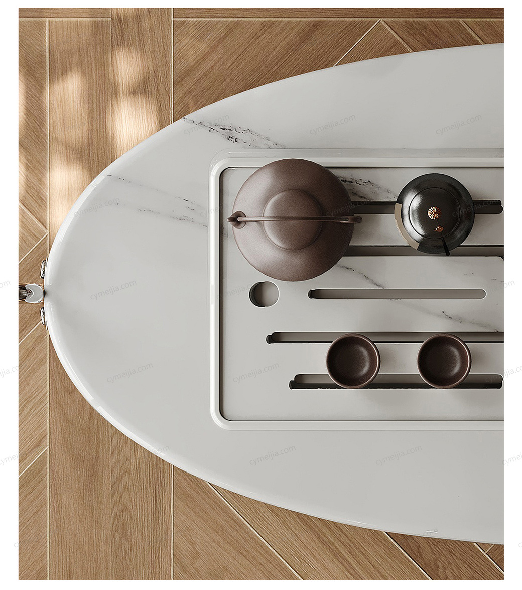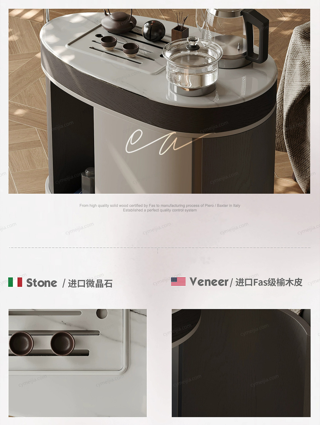 | 产品材质 : | 太空白微晶石+天然榆木皮+哑光肤感钢琴烤漆+不锈钢五金把手+E1级环保板 +茶壶 |