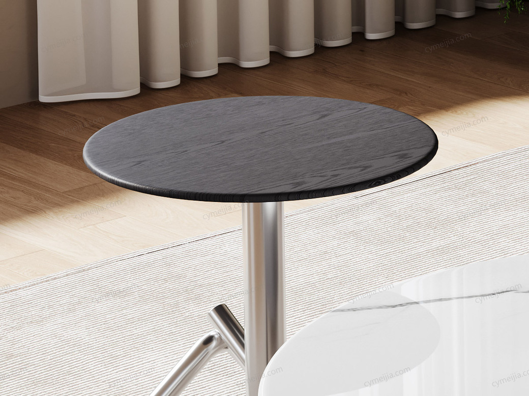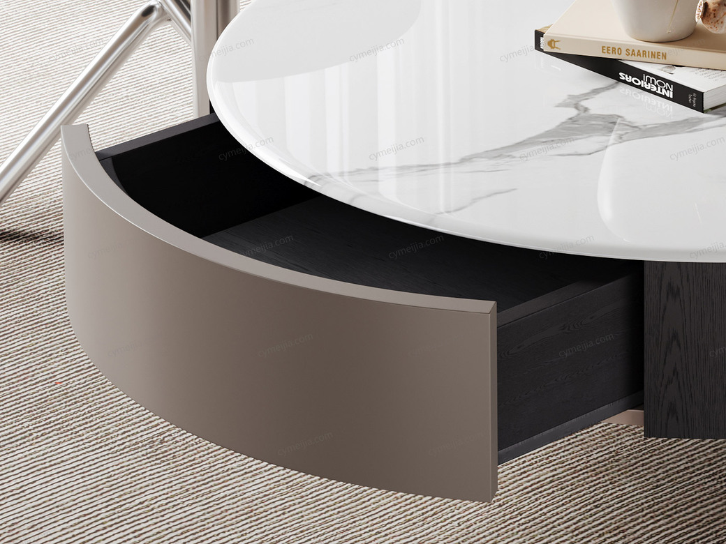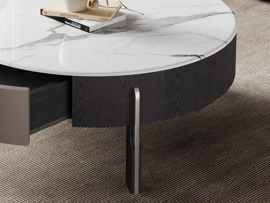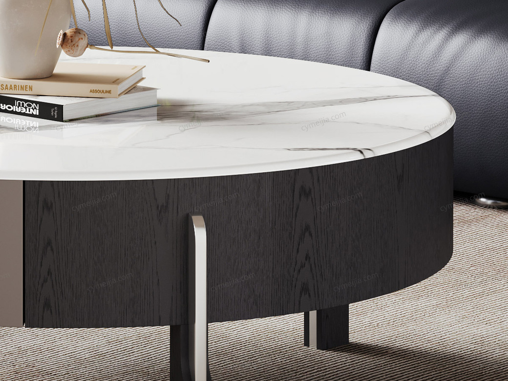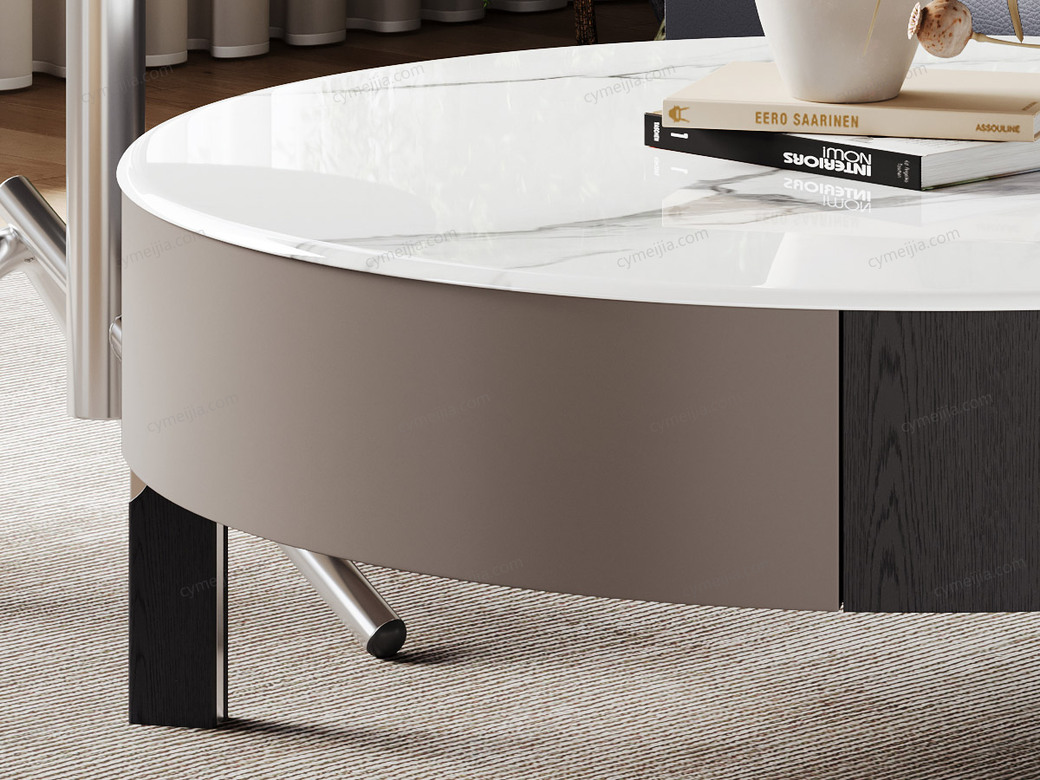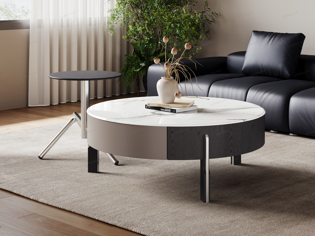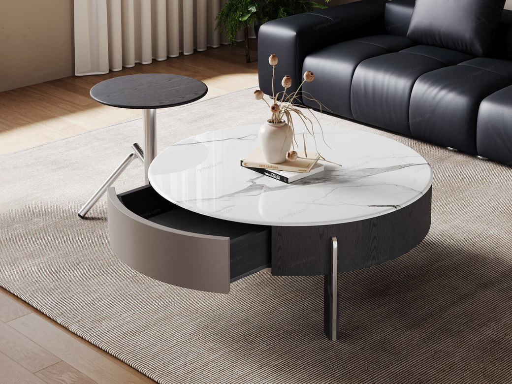 ☀ 撞色组合设计:冷调晶石几面与温润木质感碰撞,兼具轻奢精致感与家居温馨感。主茶几搭配“火箭小圆几”,使空间布局更加灵活多变。