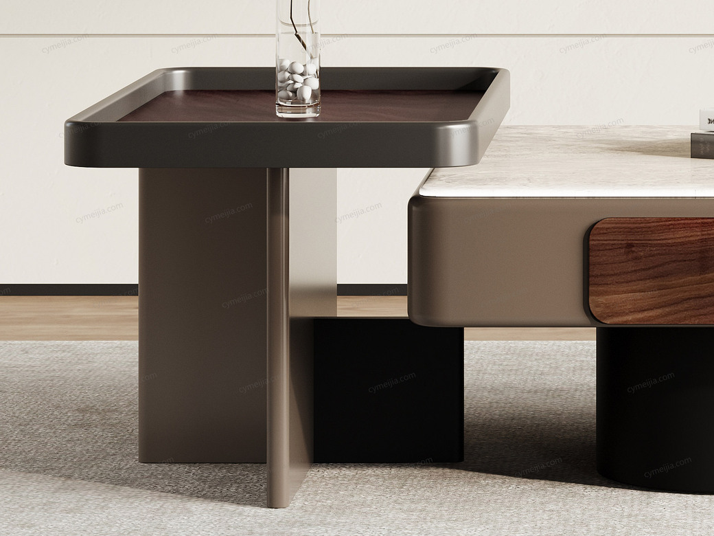 | 产品材质 : | 茶几:微晶石+黑胡桃木皮+金属漆+E1级环保板;角几:黑胡桃木皮+金属漆+E1级环保板 |