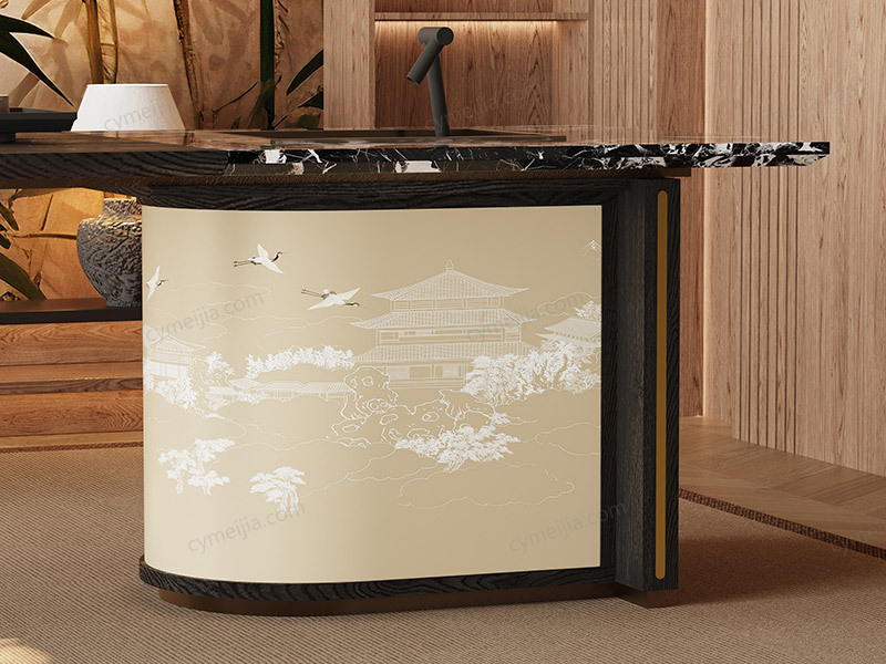 | 产品材质 : | 面板:实木多层板贴木皮(开放黑)+宝格丽黑奢石,带洗手盘+功能插座;右向方柜子:实木多层板贴木皮+不锈钢乱纹拉丝+发光超薄石(含消毒柜);圆柜子:实木多层板贴3D打印皮+不锈钢乱纹拉丝茶炉:全自动智能纯钛电茶炉 ;赠品:礼盒装茶具、茶渣桶 等 |