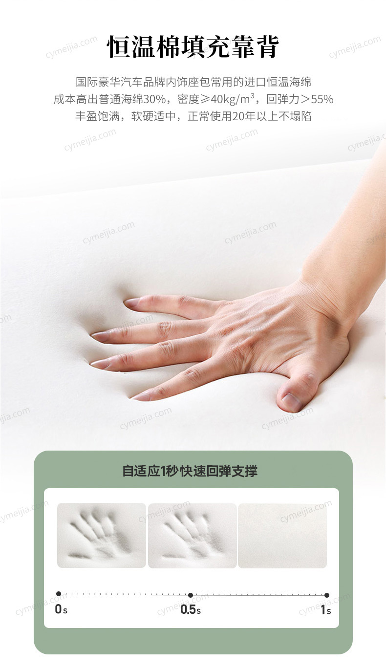 | 产品材质 : | 床头仿真皮+实木夹板内框架+10公分松木排骨架+高回弹海绵 |