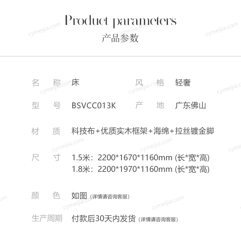 | 适配床垫 : 长2000*宽1500*厚180-220mm | 是否可定制 : 支持定制尺寸/高箱/颜色,详情请咨询客服 | 包件数 : 3 | |