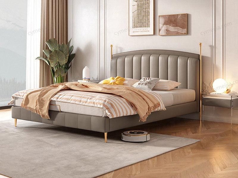 | 产品材质 : | 接触面进口头层黄牛皮+高密度海绵+俄罗斯松木框架+实木排骨架+15CM钛金色不锈钢床脚 |