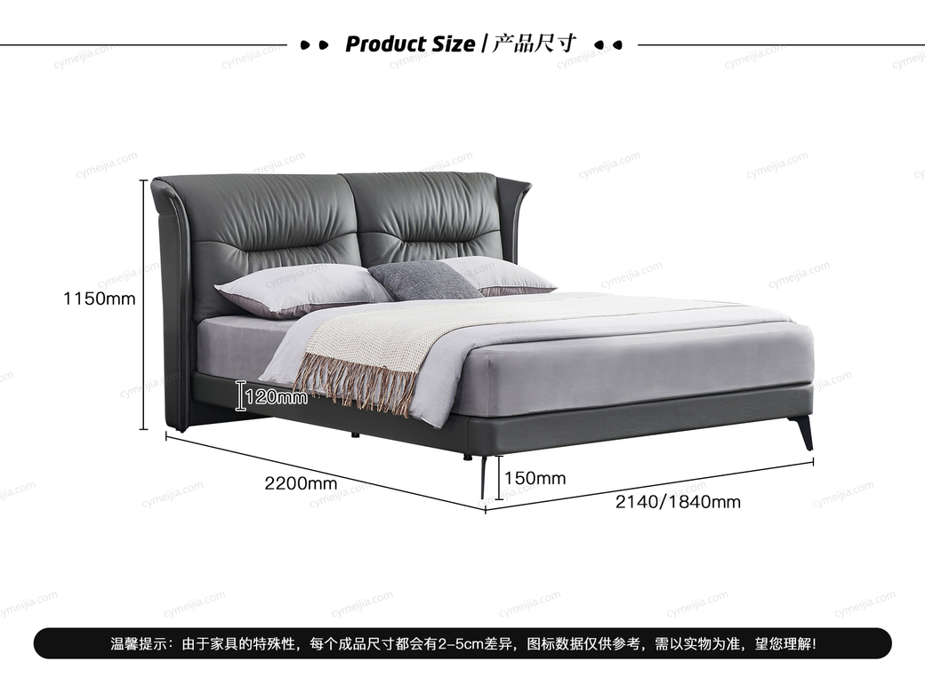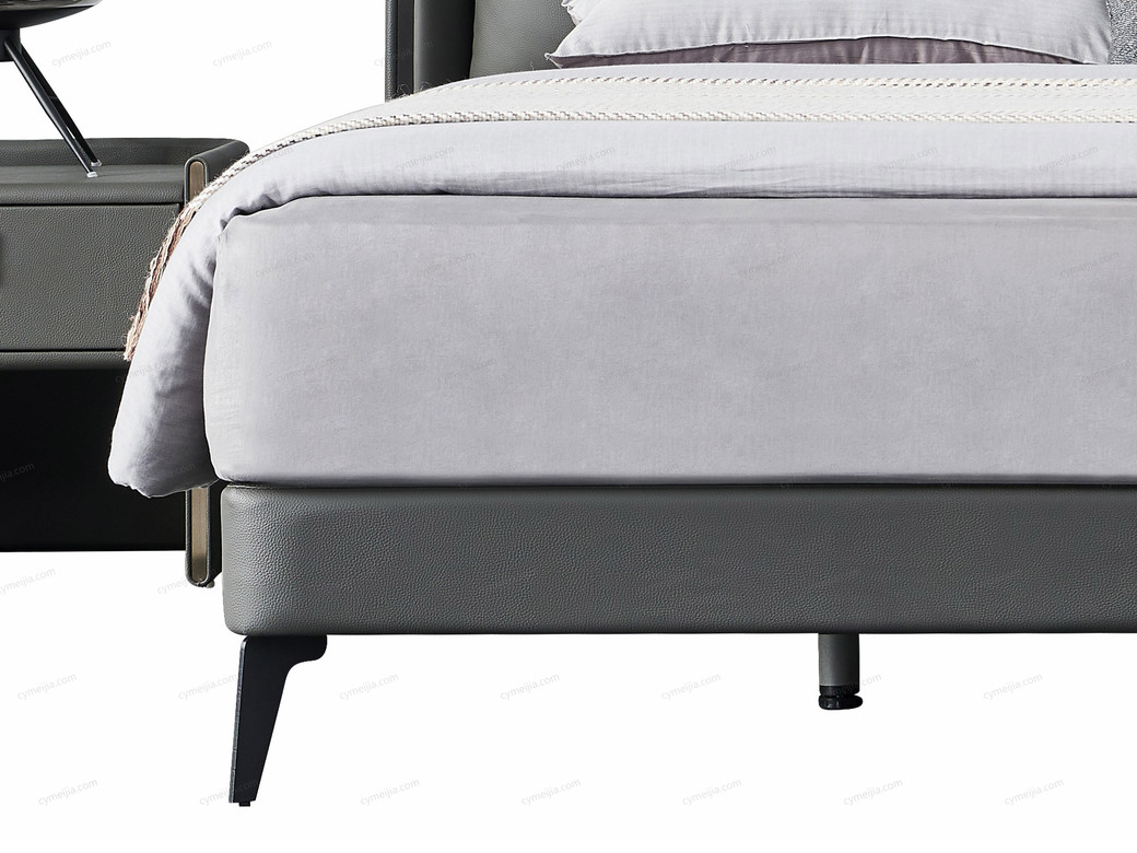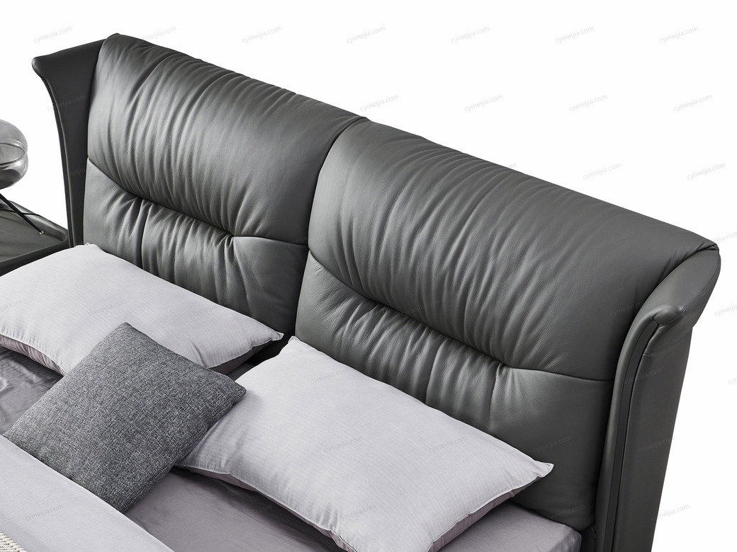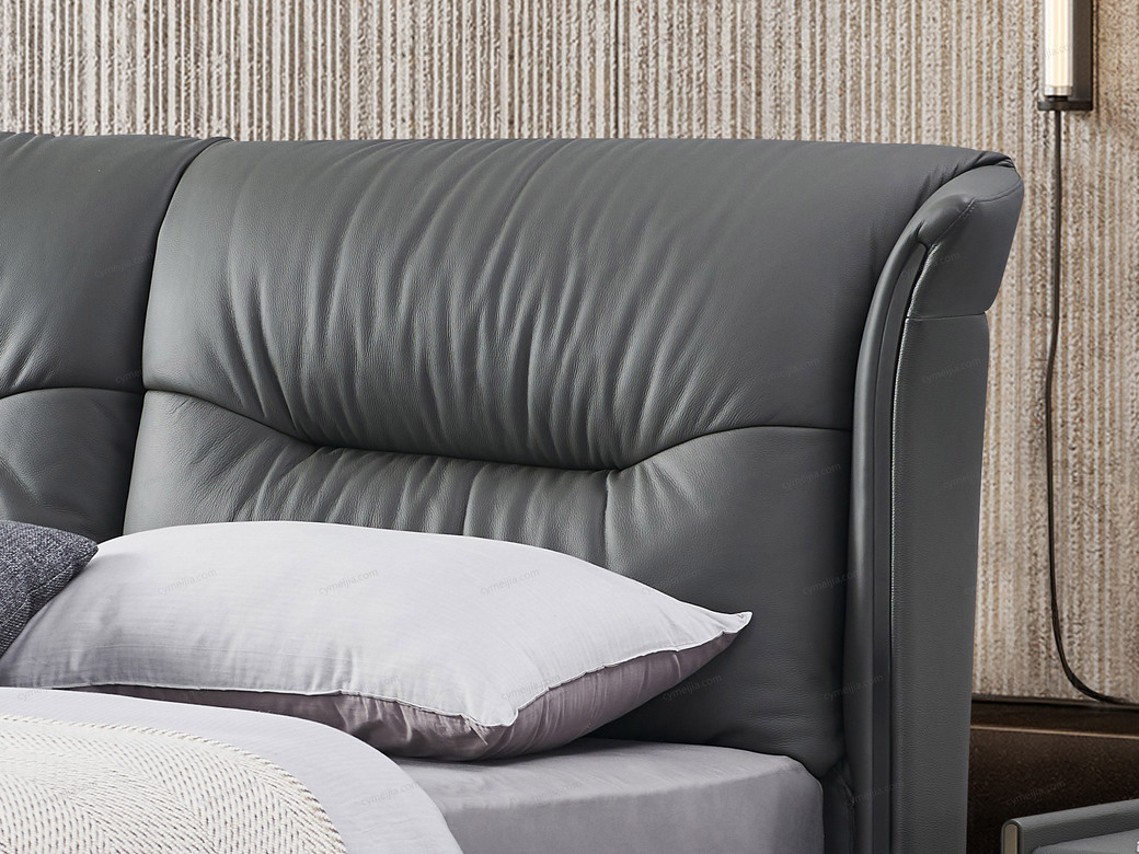 | 产品材质 : | 接触面头层牛皮+进口落叶松实木床框架+高回弹海棉+钢木排骨架 |