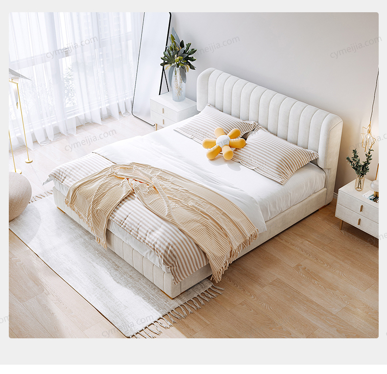| 产品材质 : | 磨砂布+高回弹海绵+松木方+实木多层板+10公分松木排骨架+电镀金色脚 |