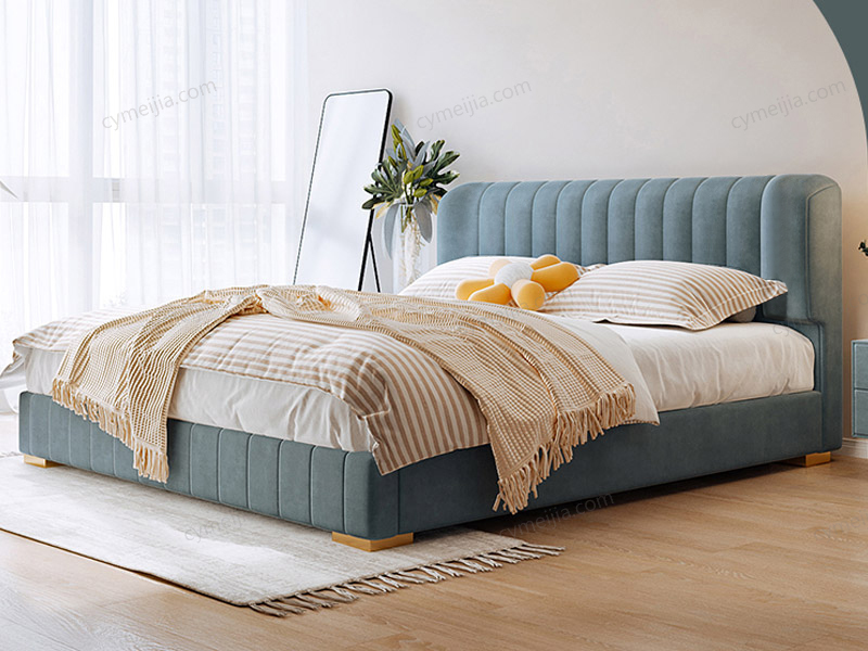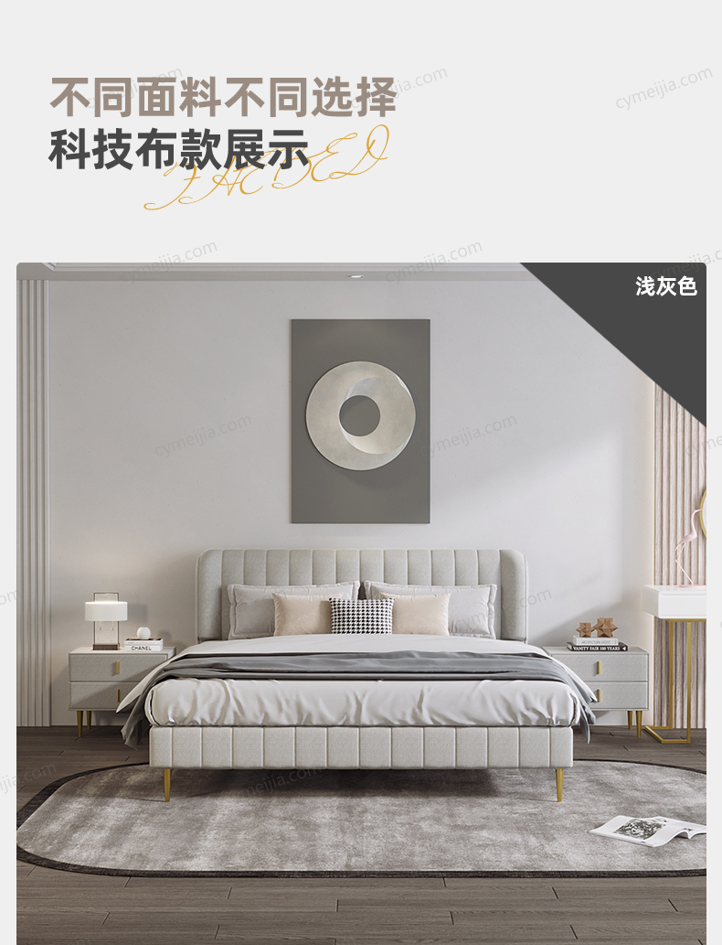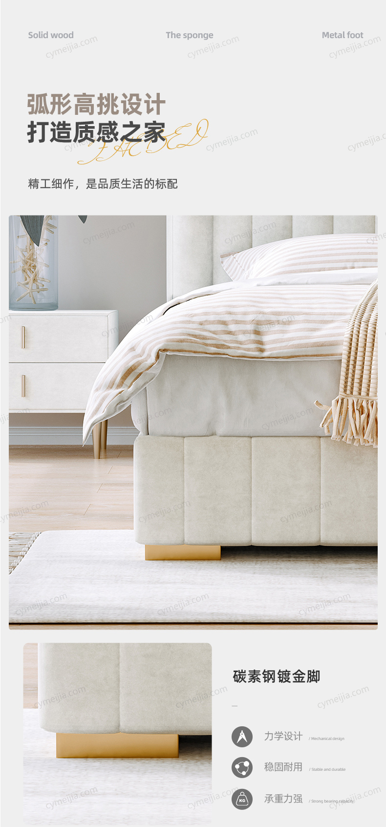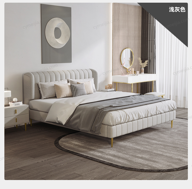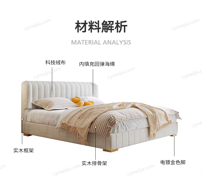 | 产品材质 : | 磨砂布+高回弹海绵+松木方+实木多层板+10公分松木排骨架+电镀金色脚 |