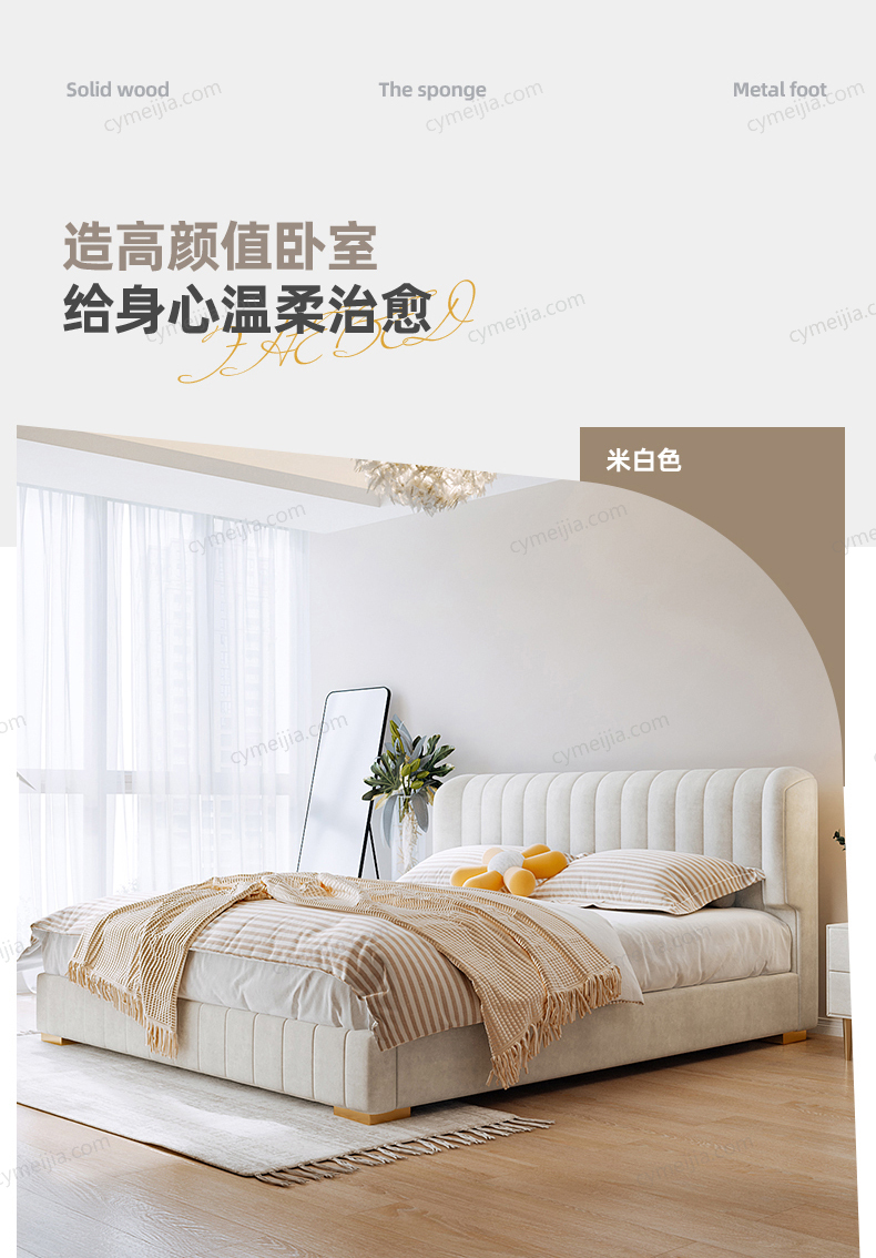 | 产品材质 : | 磨砂布+高回弹海绵+松木方+实木多层板+10公分松木排骨架+电镀金色脚 |