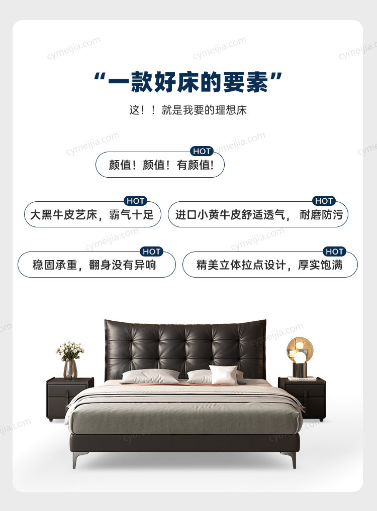 | 产品材质 : | 接触面进口头层黄牛皮+高密度海绵+俄落叶松实木框架+金属脚+10公分松木排骨架 |