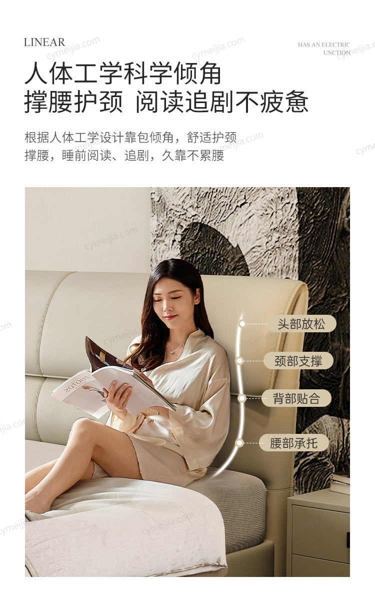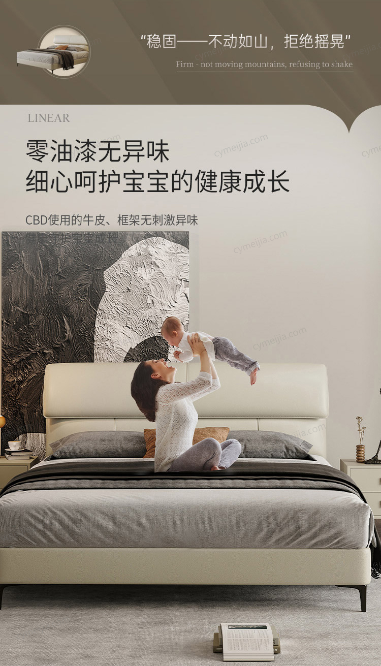 ☀ 精细的裁皮与缝合工艺,针脚均匀、边缘平整,床体结构经过人体工学与力学的双重优化,美观性与实用性兼具。