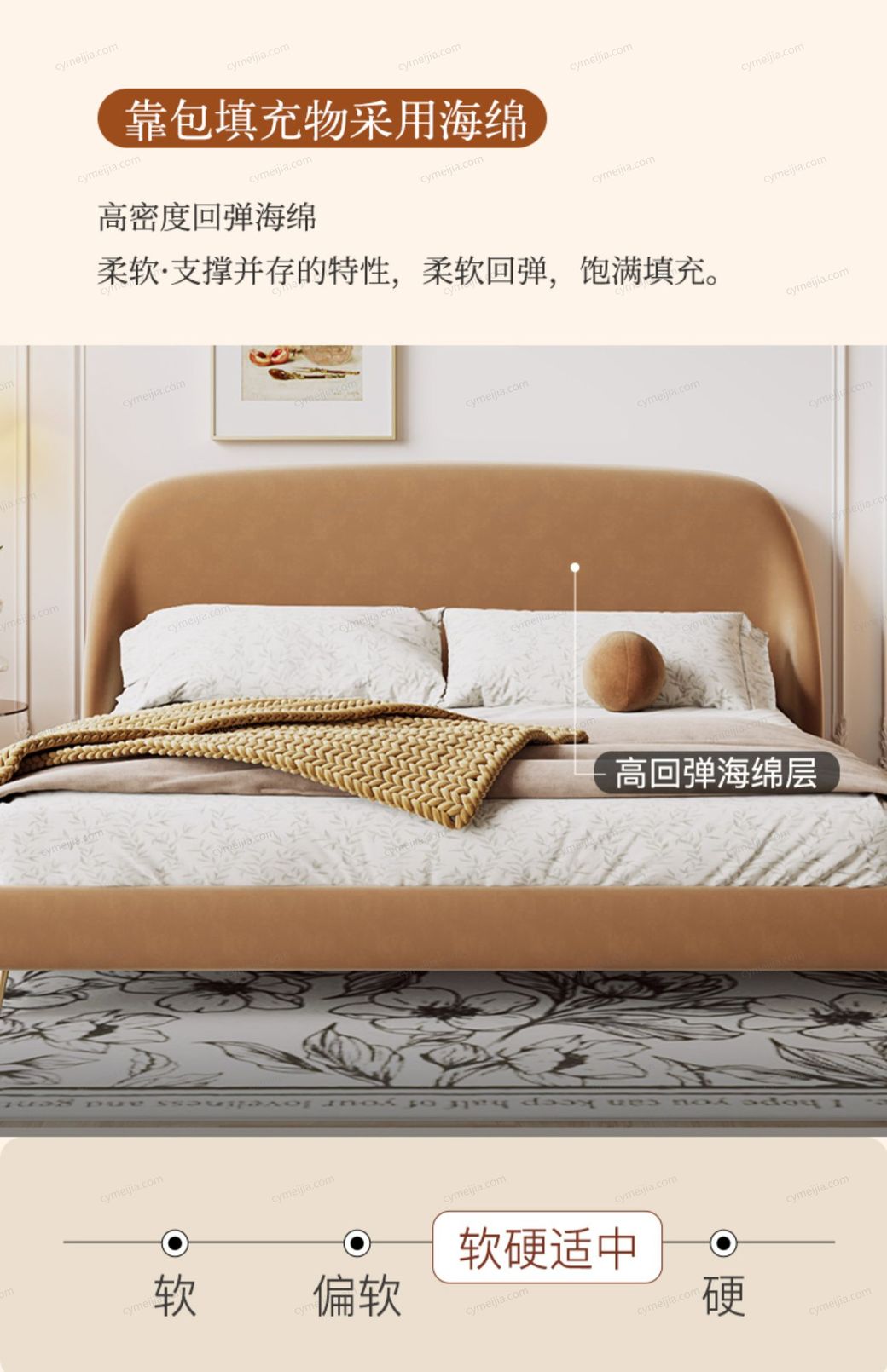 | 产品材质 : | 磨砂布+高回弹海绵+松木方+实木多层板+10公分松木排骨架+电镀金色脚 |