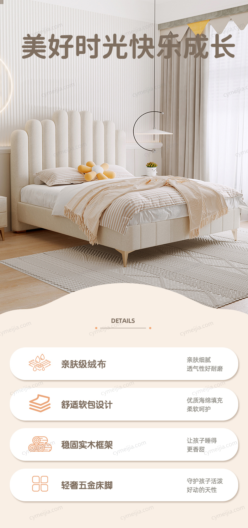| 产品材质 : | 亲肤绒布+全实木框架+高回弹海绵+十公分松木排骨架+电镀金色脚 |