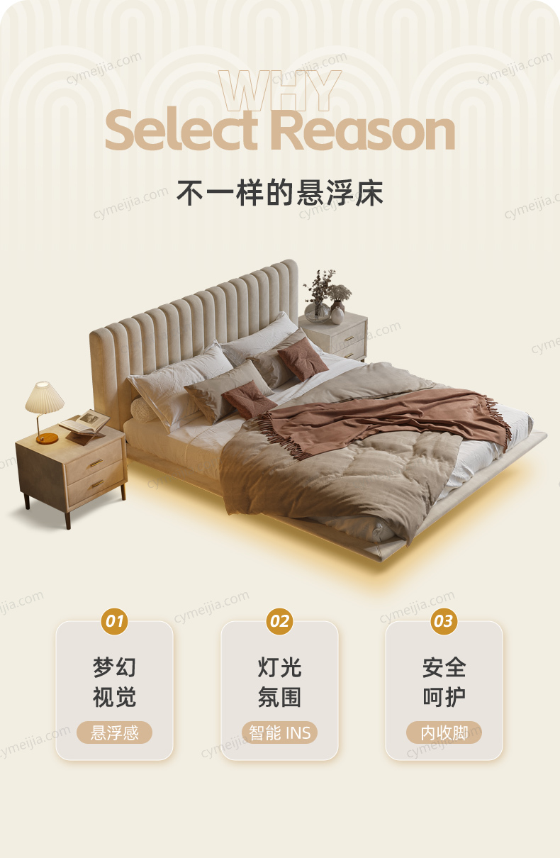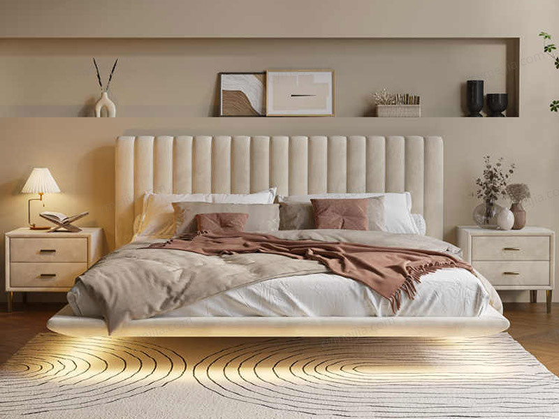 | 产品材质 : | 亲肤绒布+全实木框架+高回弹海绵++十公分松木排骨架+人体感应式灯带 |