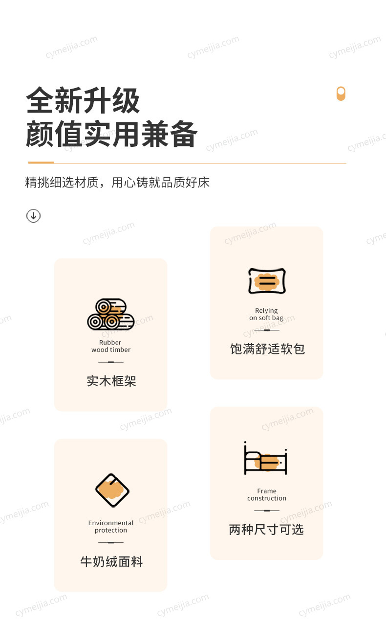 | 产品材质 : | 牛奶绒+高回弹海绵+实木框架+五金脚+搭配10公分松木排骨架 |