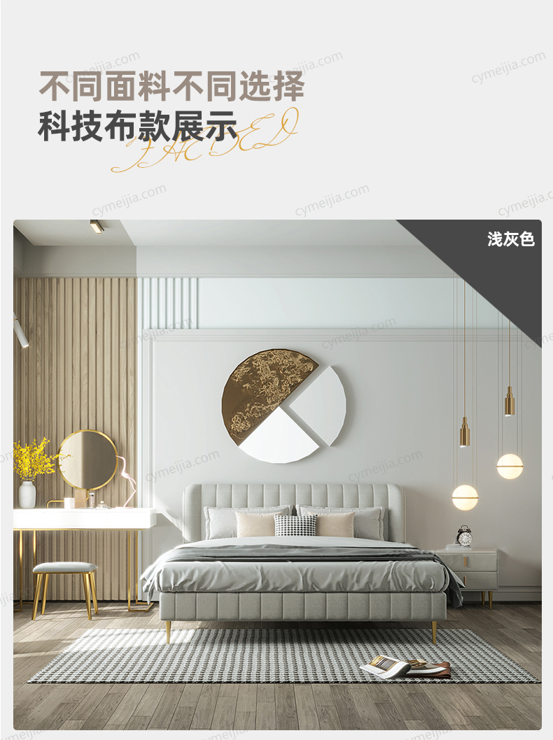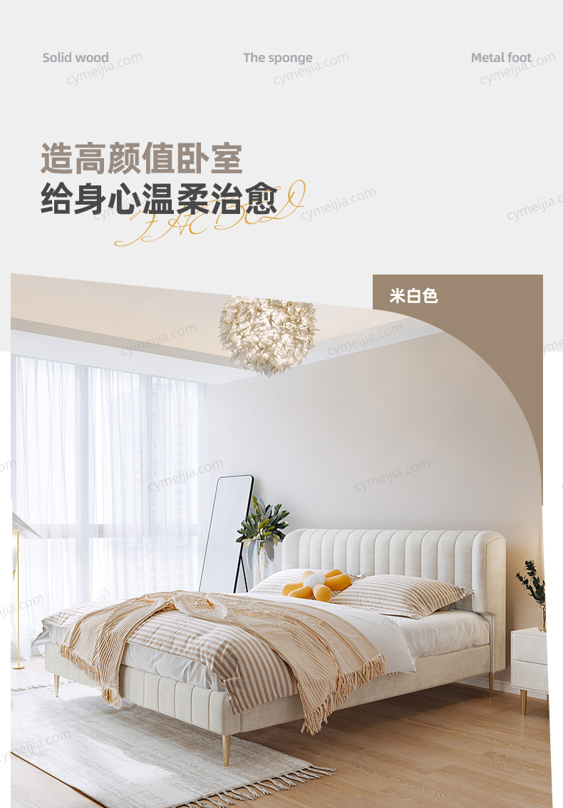 | 产品材质 : | 磨砂布+高回弹海绵+松木方+实木多层板+10公分松木排骨架+电镀金色脚 |