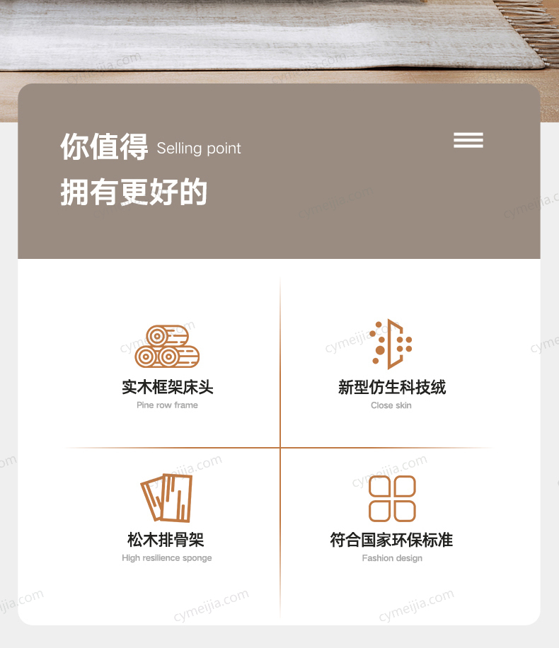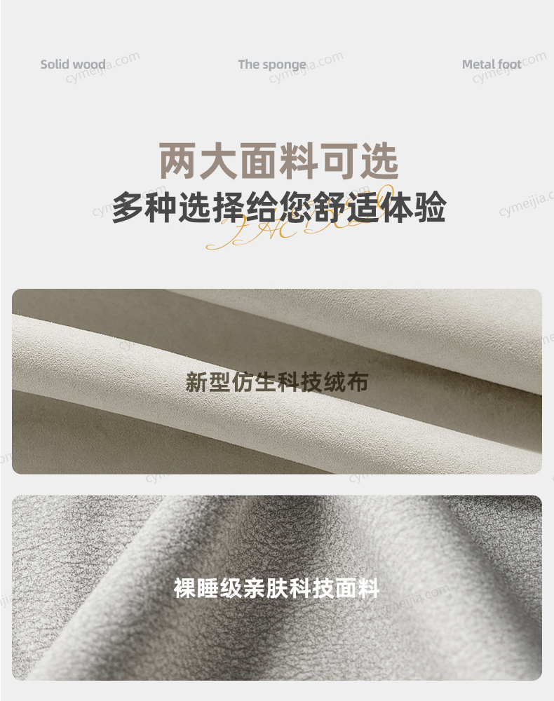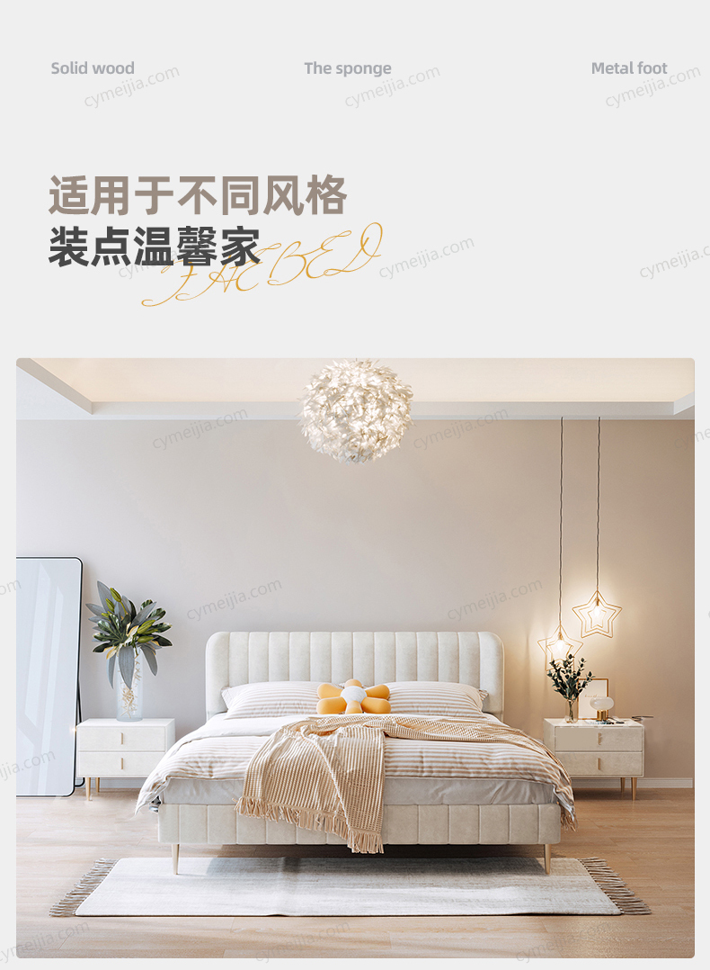 | 产品材质 : | 磨砂布+高回弹海绵+松木方+实木多层板+10公分松木排骨架+电镀金色脚 |