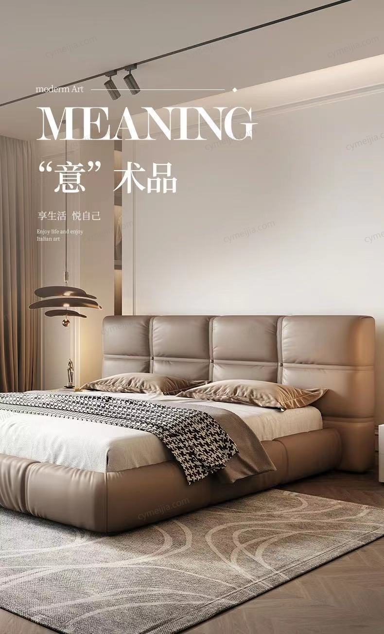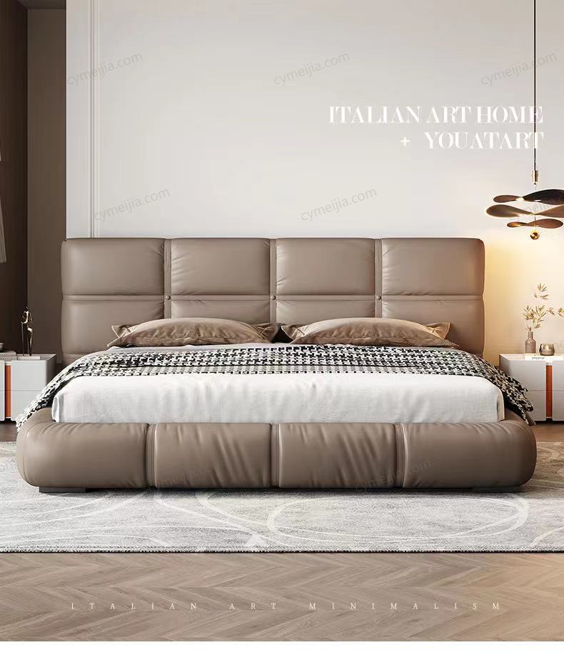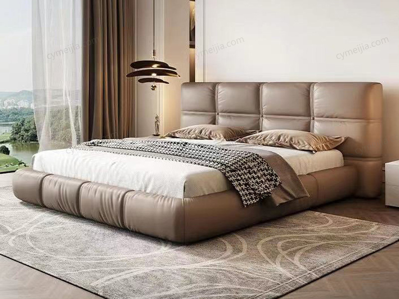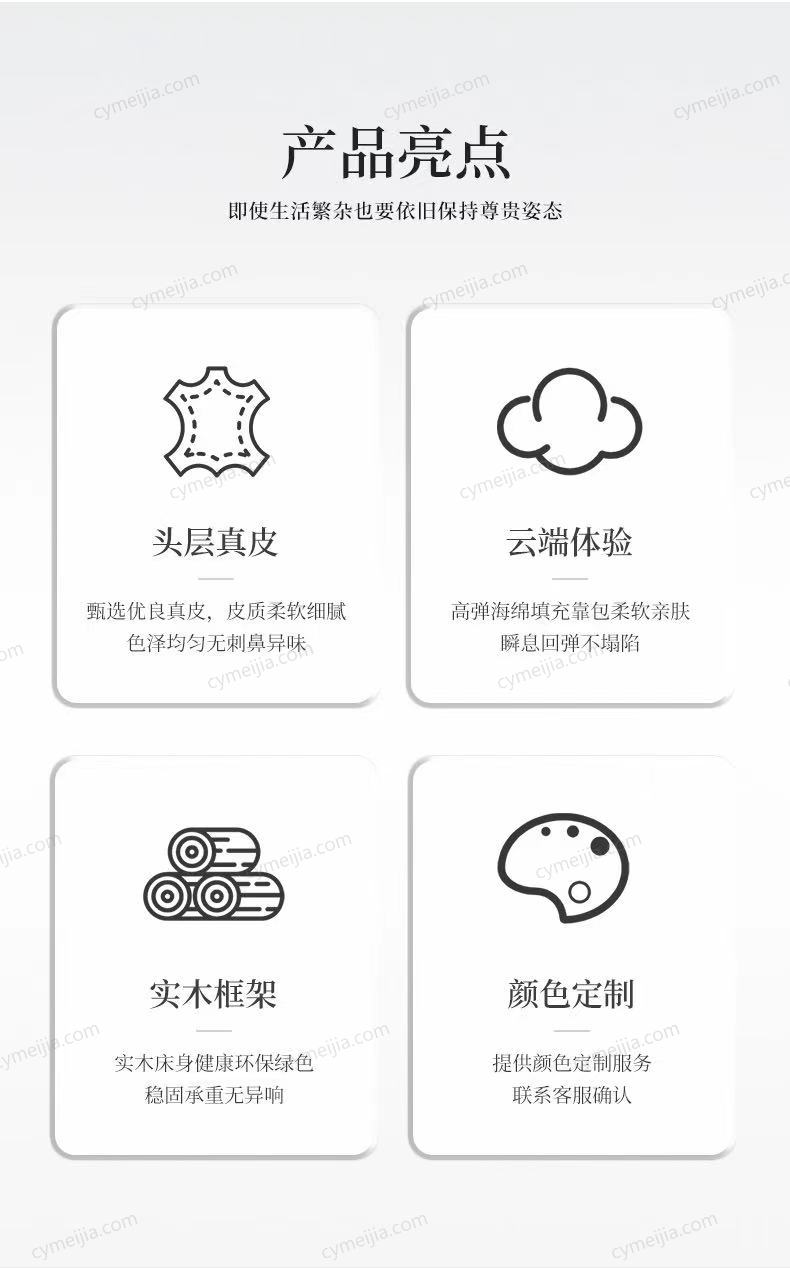 | 产品材质 : | 接触面进口头层黄牛皮+高回弹海绵+实木框架+5公分床脚+10公分松木排骨架 |