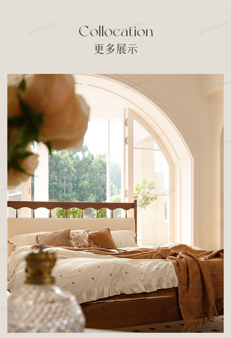 ☀ 床头立柱由整根实木手工旋切打磨而成,木纹连贯流畅,触感温润圆滑,尽显匠人手作的温度与安心感。