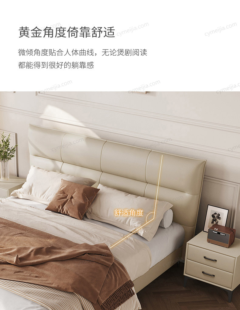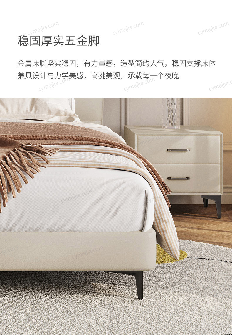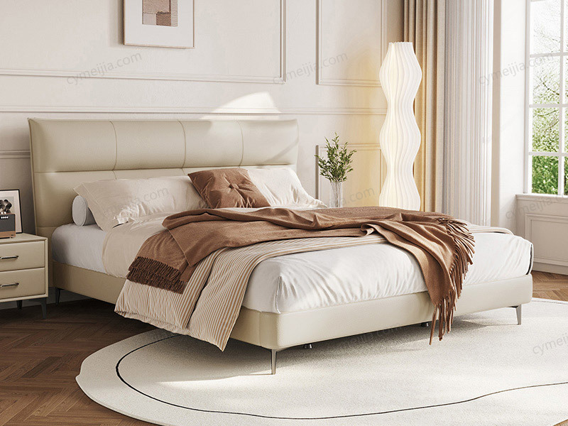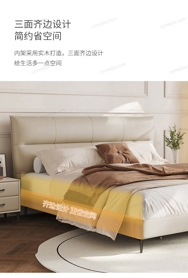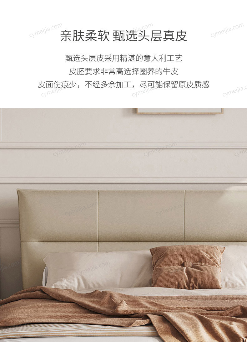 | 产品材质 : | 接触面进口头层黄牛皮+高密度海绵+实木床架+碳素钢脚+10公分松木排骨架 |