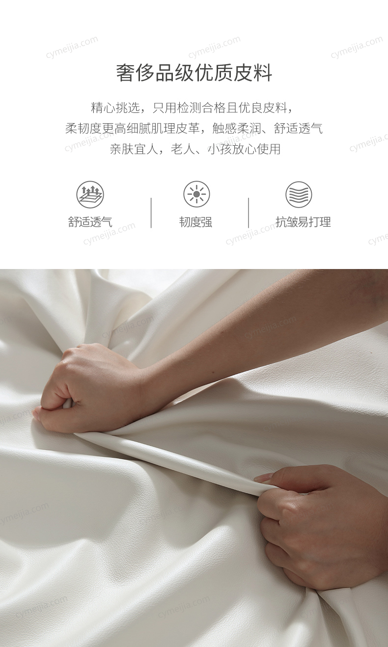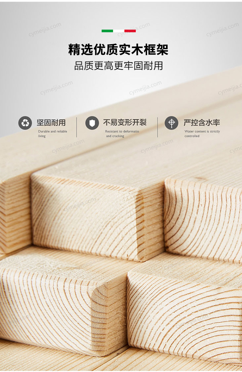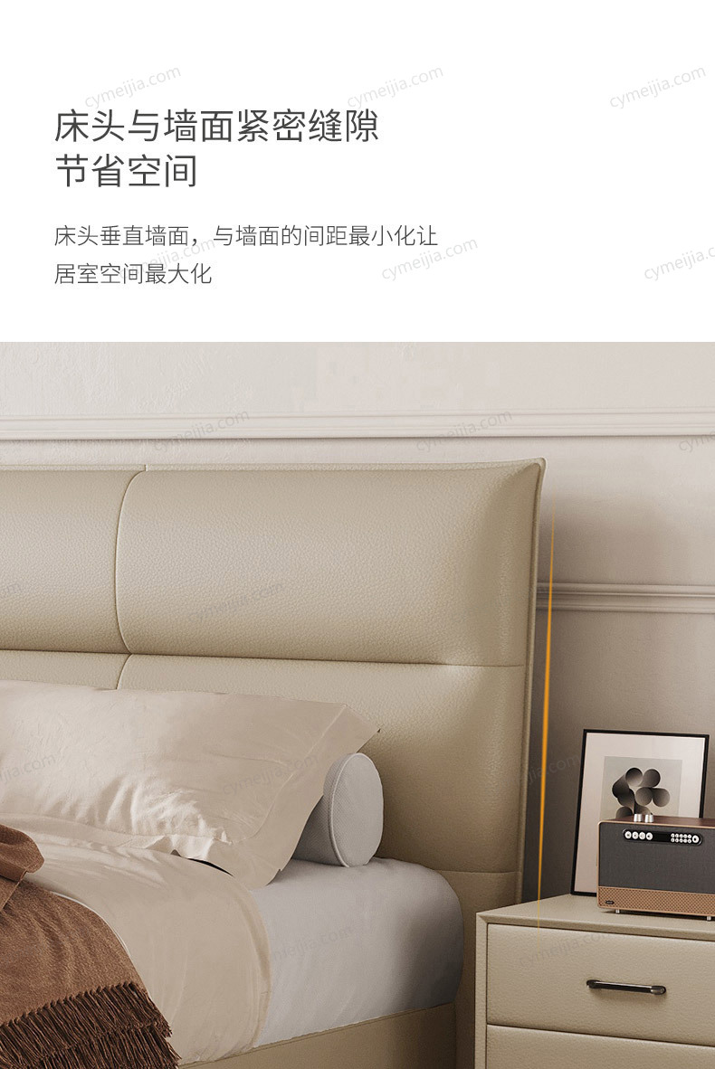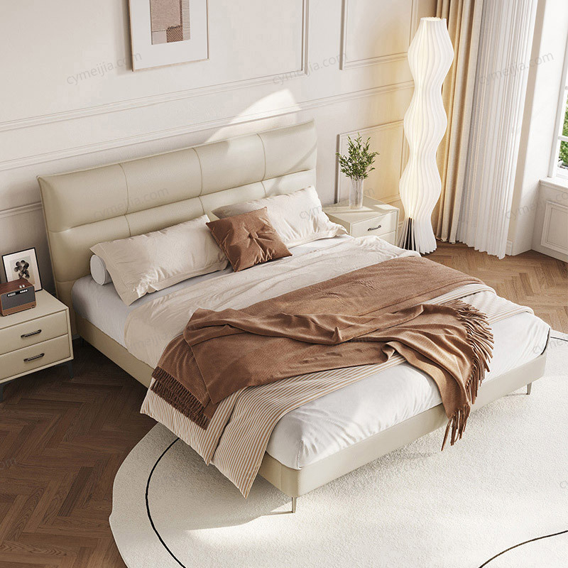 | 产品材质 : | 接触面进口头层黄牛皮+高密度海绵+实木床架+碳素钢脚+10公分松木排骨架 |