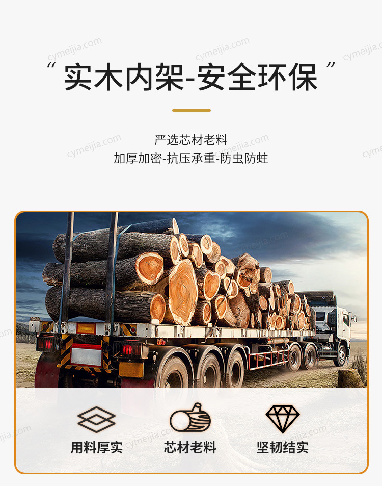| 产品材质 : | 仿真皮+不绣钢底架+落叶松实木框架+实木多层板+高回弹海棉+不锈钢脚+10公分松木排骨架 |