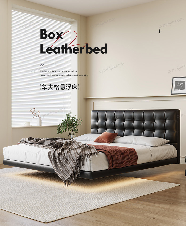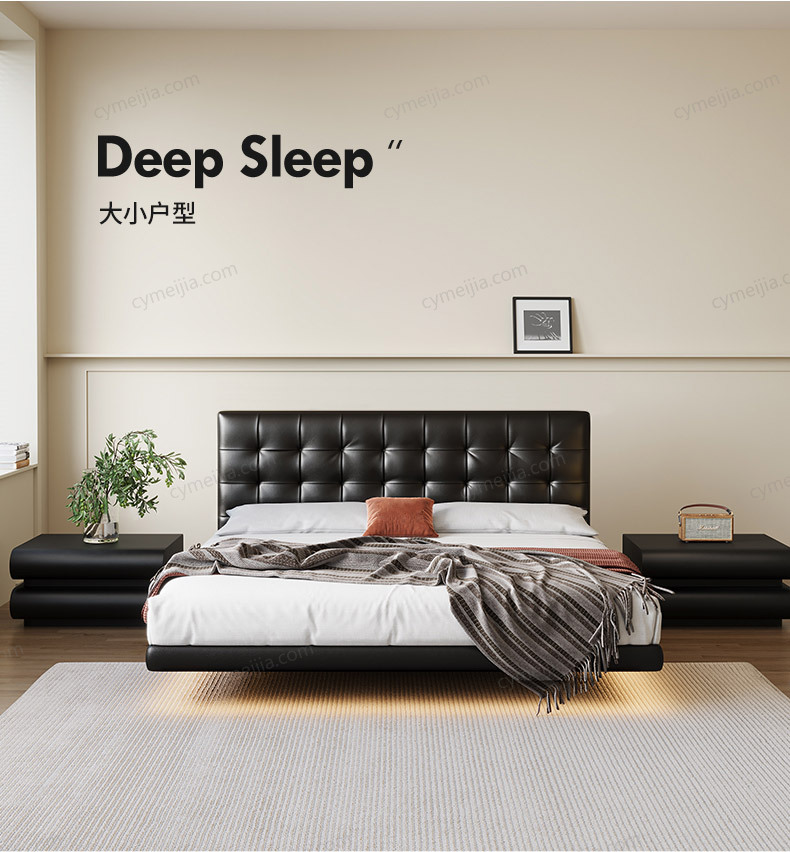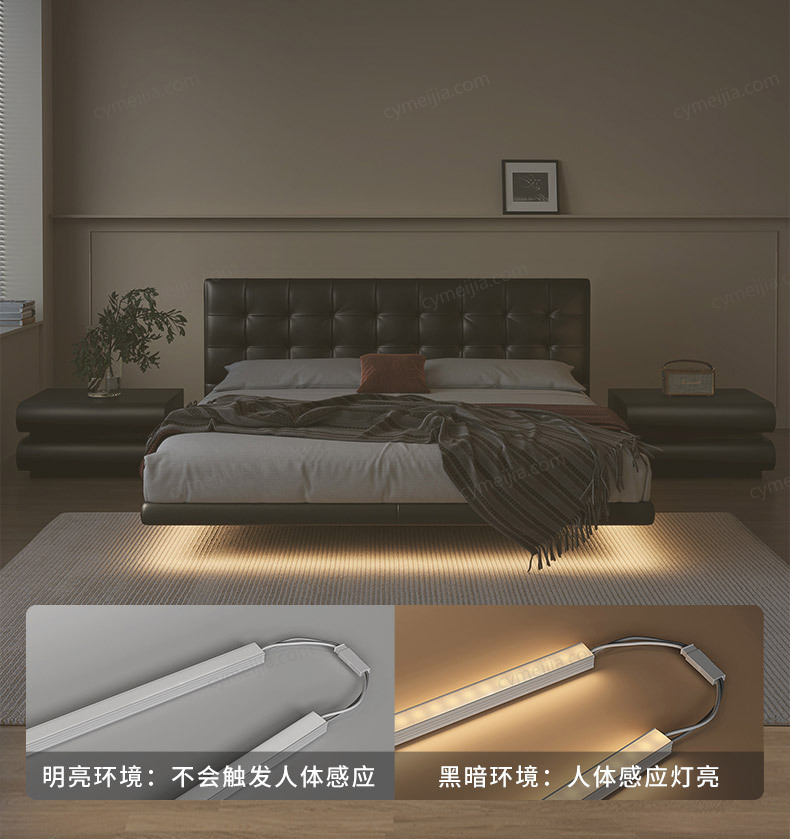 | 产品材质 : | 仿真皮+俄罗斯落叶松实木框架+高密度海绵+灯带+碳素钢脚+10公分松木排骨架 |